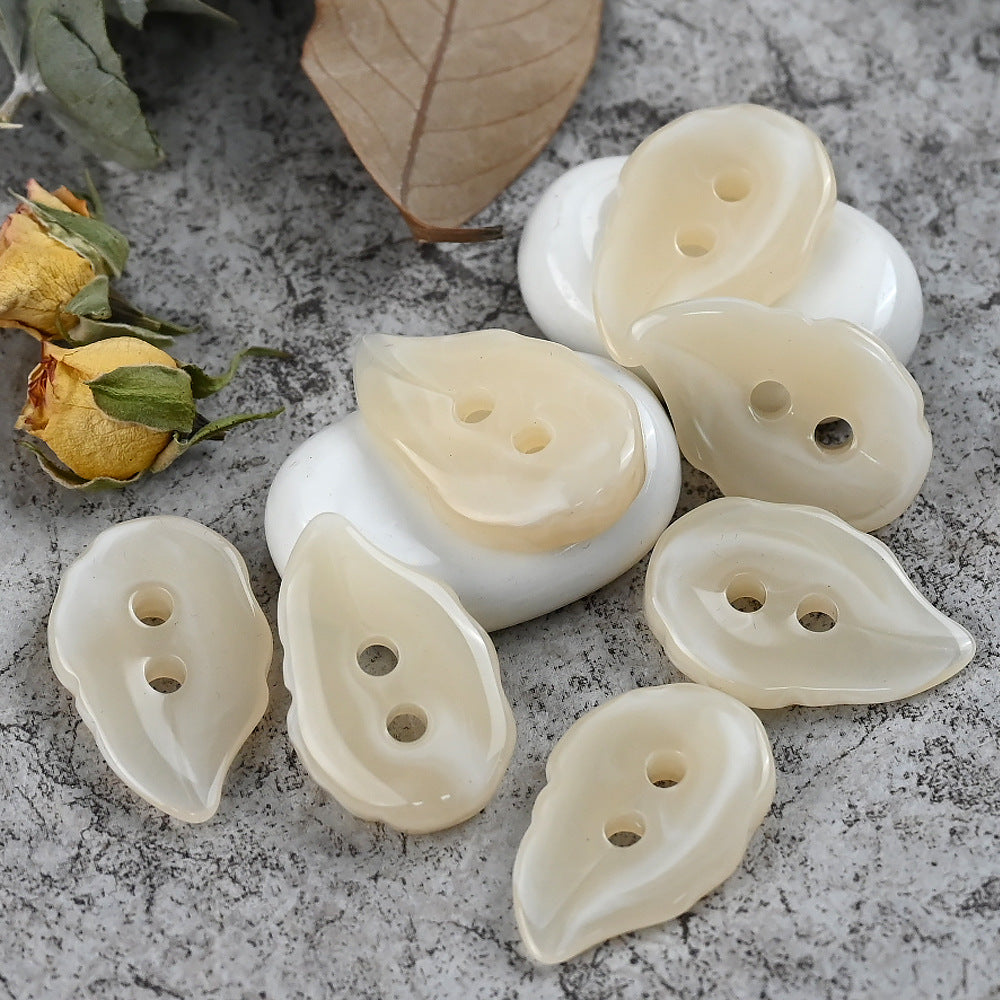 32x21mm rav beige uregelmæssige bladformede 2-huls harpiks knapper til frakker 40 stk