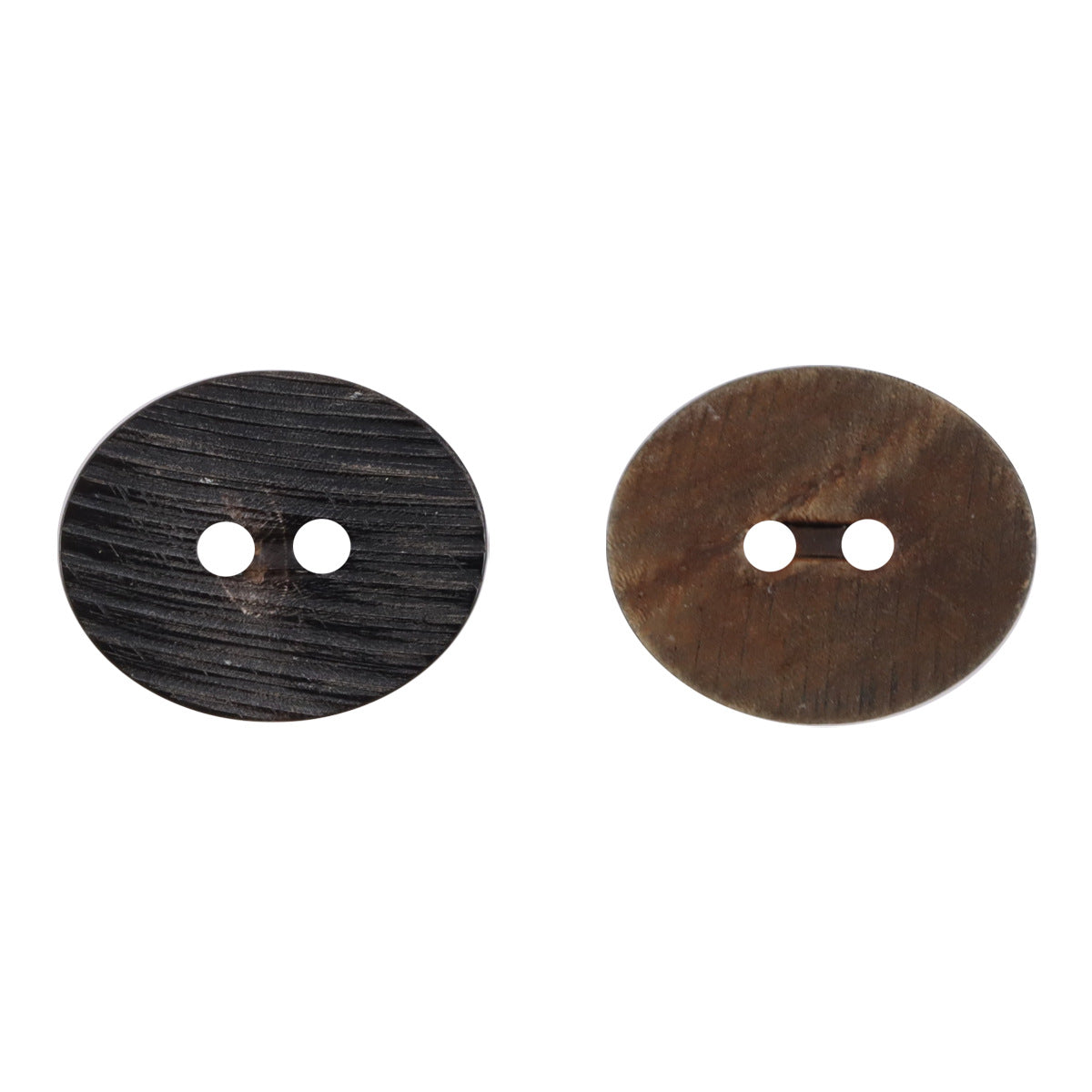 Disse knapper er lavet af naturligt sort oksehorn, et materiale kendt for sin holdbarhed og unikke æstetik. Brug af naturligt oksehorn giver ikke kun knapperne en rig, mørk farve, men giver dem også en særpræget tekstur og varme, som syntetiske materialer ikke kan efterligne. Hver knap er et naturprodukt med små variationer i hornets mønster og farve, hvilket gør hver knap helt unik.