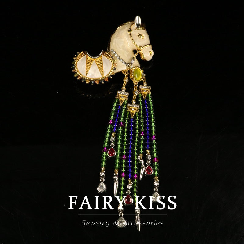 Brochen fremviser et smukt udført pony-design, prydet med levende emaljedetaljer, der bringer stykket til live. Det indviklede kvastvedhæng tilføjer bevægelse og flair, mens de skinnende zirkonia-sten giver et strejf af luksus. Uanset om du accessoriserer en jakke, kjole, tørklæde eller taske, vil denne broche helt sikkert tiltrække opmærksomhed og skabe samtaler.