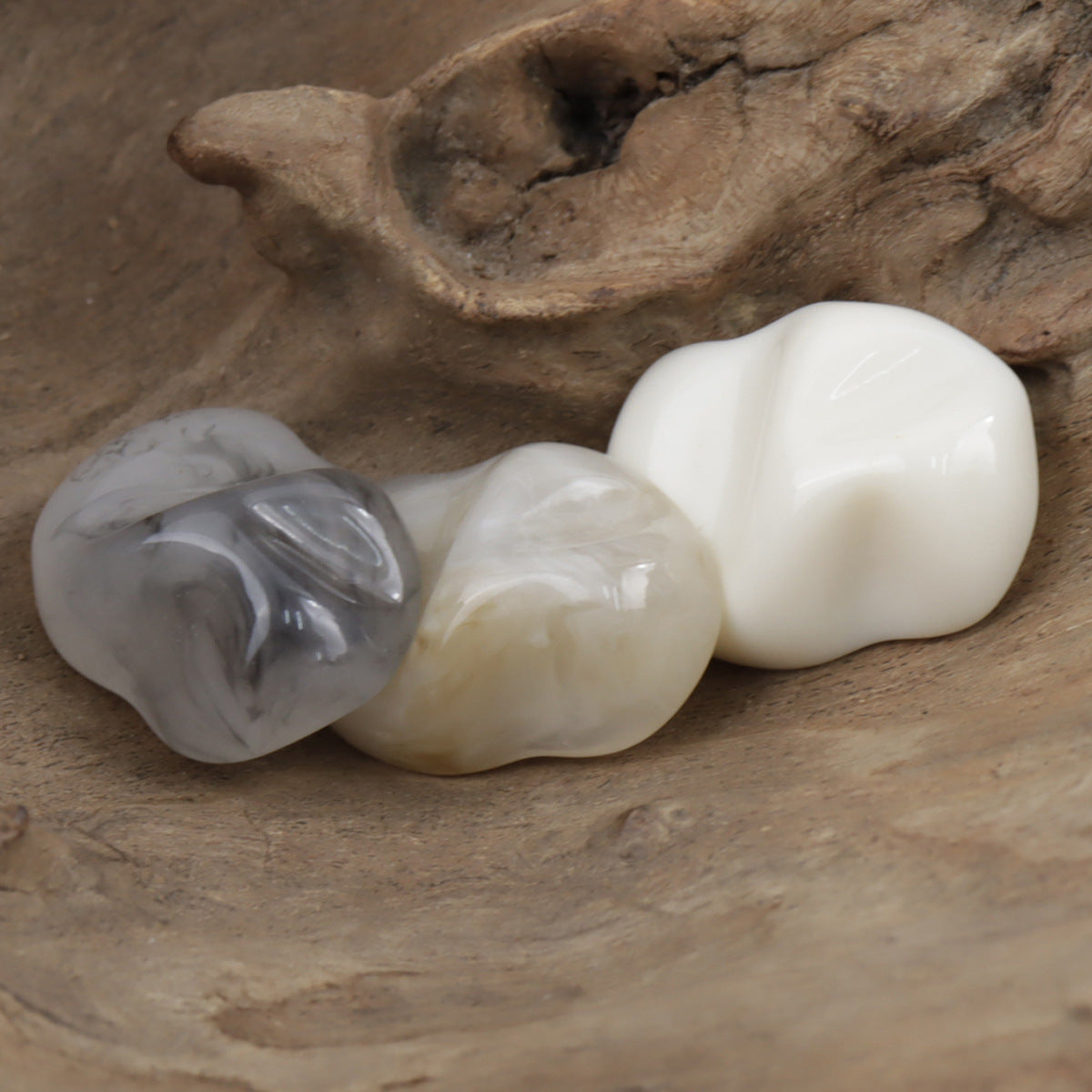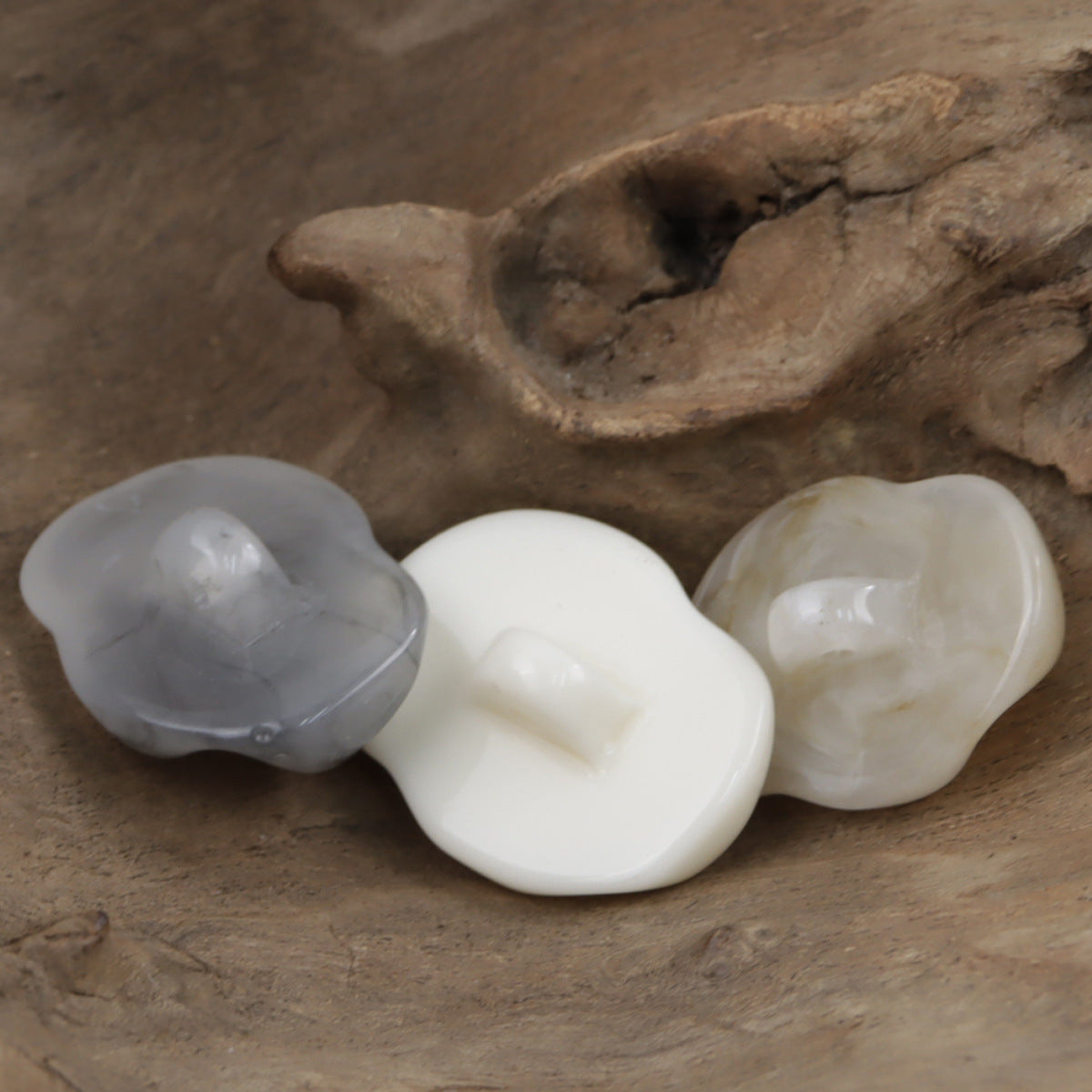 Den imiterede jade tekstur giver disse knapper et luksuriøst udseende, mens den gennemsigtige kvalitet tilføjer et strejf af mystik. Den uregelmæssige form gør hver knap til et unikt stykke.