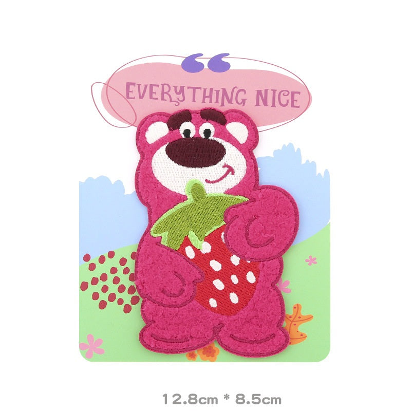 Bedårende lyserøde Strawberry Bear selvklæbende broderede patches 3 stk