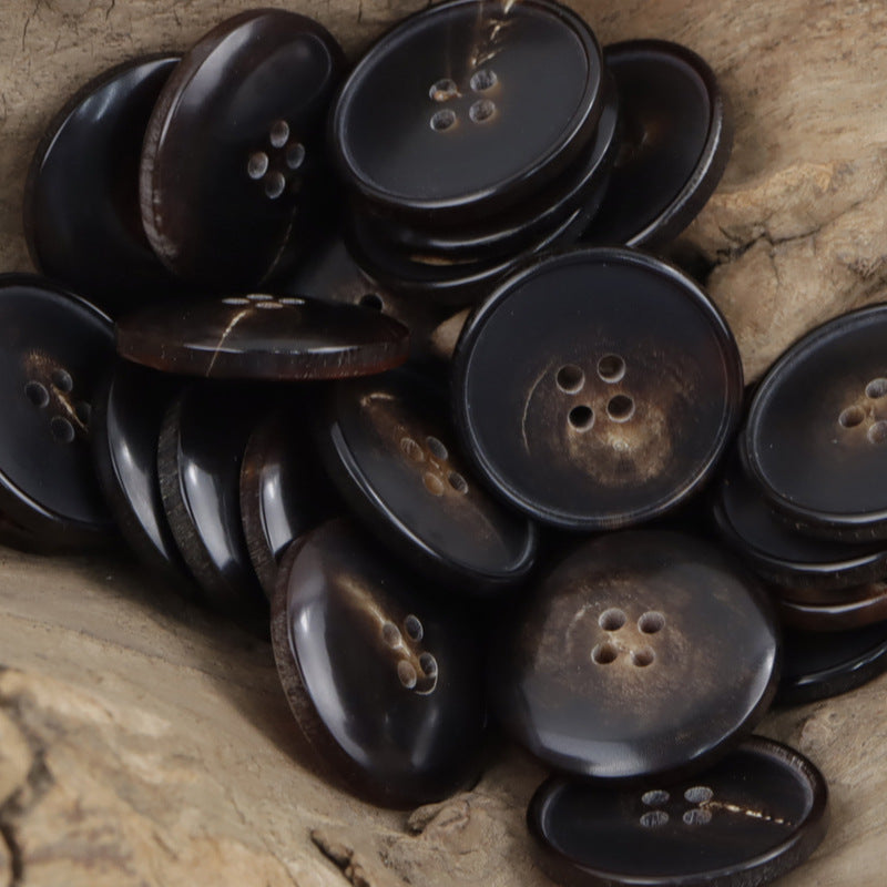 Disse knapper er lavet af naturligt oksehorn, som er et materiale af høj kvalitet og holdbarhed. Brug af ægte oksehorn giver knapperne en unik tekstur og udseende, som ikke kan efterlignes af syntetiske materialer. Det tilføjer også et strejf af naturlig elegance til ethvert stykke tøj.