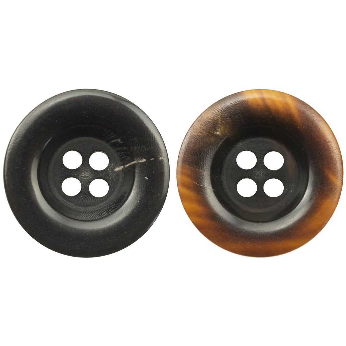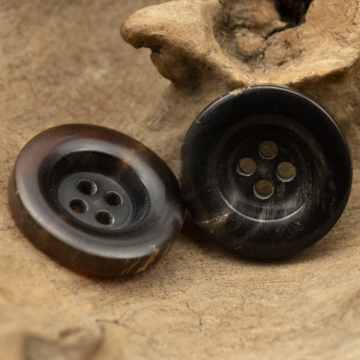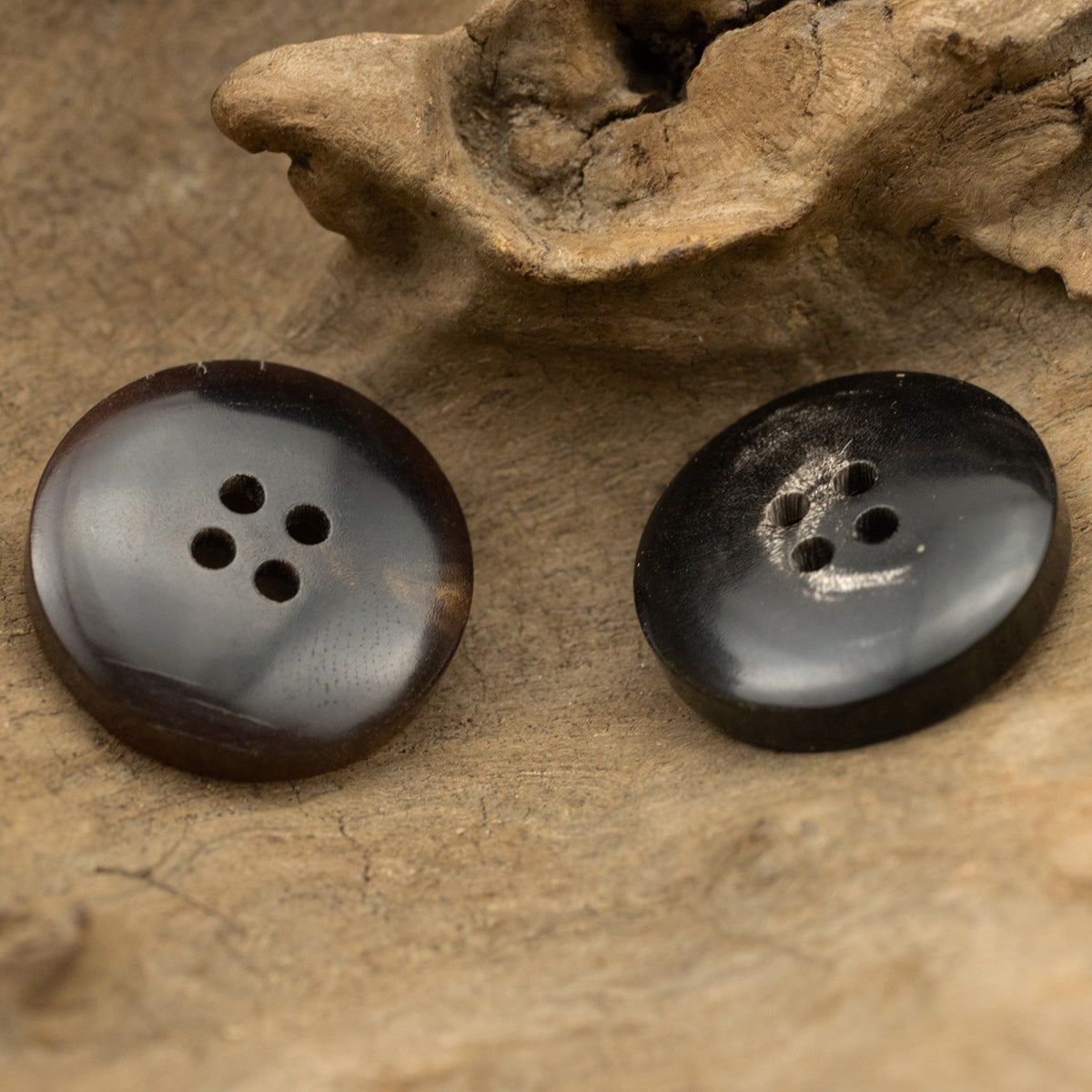 Hornmaterialet, der bruges i disse knapper, giver dem et naturligt og luksuriøst udseende. Den kaffe-farvede nuance tilføjer et strejf af sofistikering, hvilket gør dem perfekte til læderjakker. Hver knap har et unikt mønster og tekstur, som er karakteristisk for horn, hvilket tilføjer et element af individualitet til dit tøj.