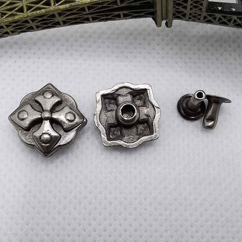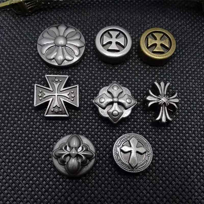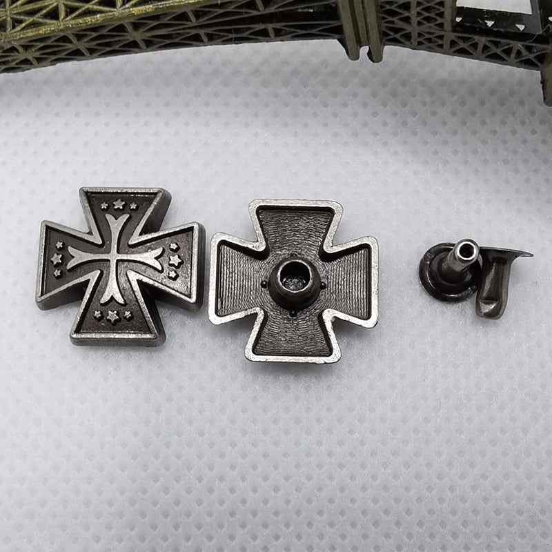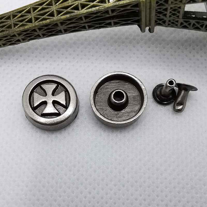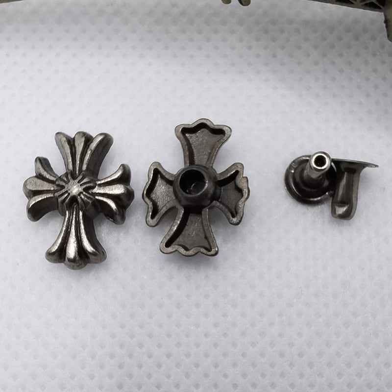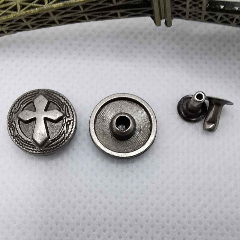 Fremstillet af holdbar zinklegering med en antik sølvfinish, modstår disse knapper misfarvning og tåler daglig brug. Den klassiske runde form og det hævede korsmotiv skaber et markant look, ideelt til biker-stil, punkmode eller western-inspirerede outfits.