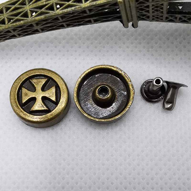 Tilføj en dristig, retro-inspireret kant til din denim med disse antik-sølv runde korsnitter. Perfekte til at tilpasse jeans, jakker eller DIY-modeprojekter, hver knap har et slående korsdesign med slidte detaljer, der fremkalder en rå, vintage æstetik.