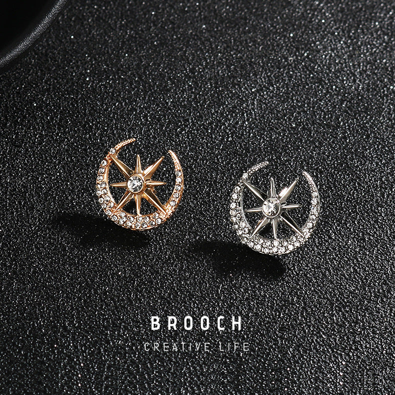 Είτε παρευρίσκεστε σε μια επίσημη εκδήλωση είτε απλώς θέλετε να προσθέσετε λίγη λάμψη στην καθημερινή σας εμφάνιση, αυτή η καρφίτσα κοστουμιού με χρυσό και ασημί, διακοσμημένη με διαμάντια σε σχήμα φεγγαριού και οκτακτινής αστέρας, είναι η τέλεια επιλογή.