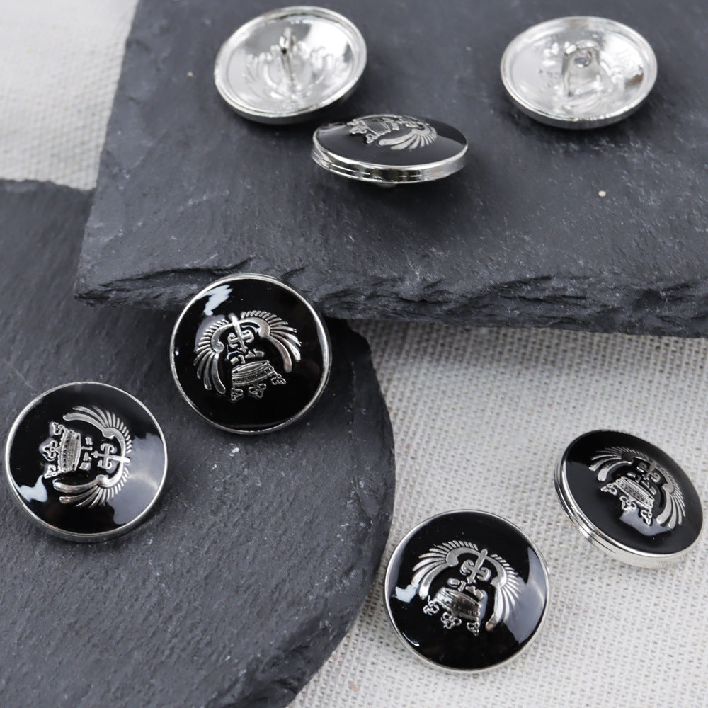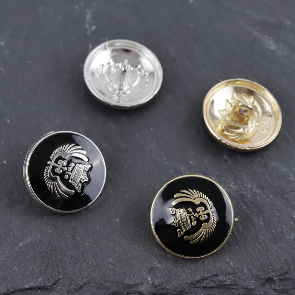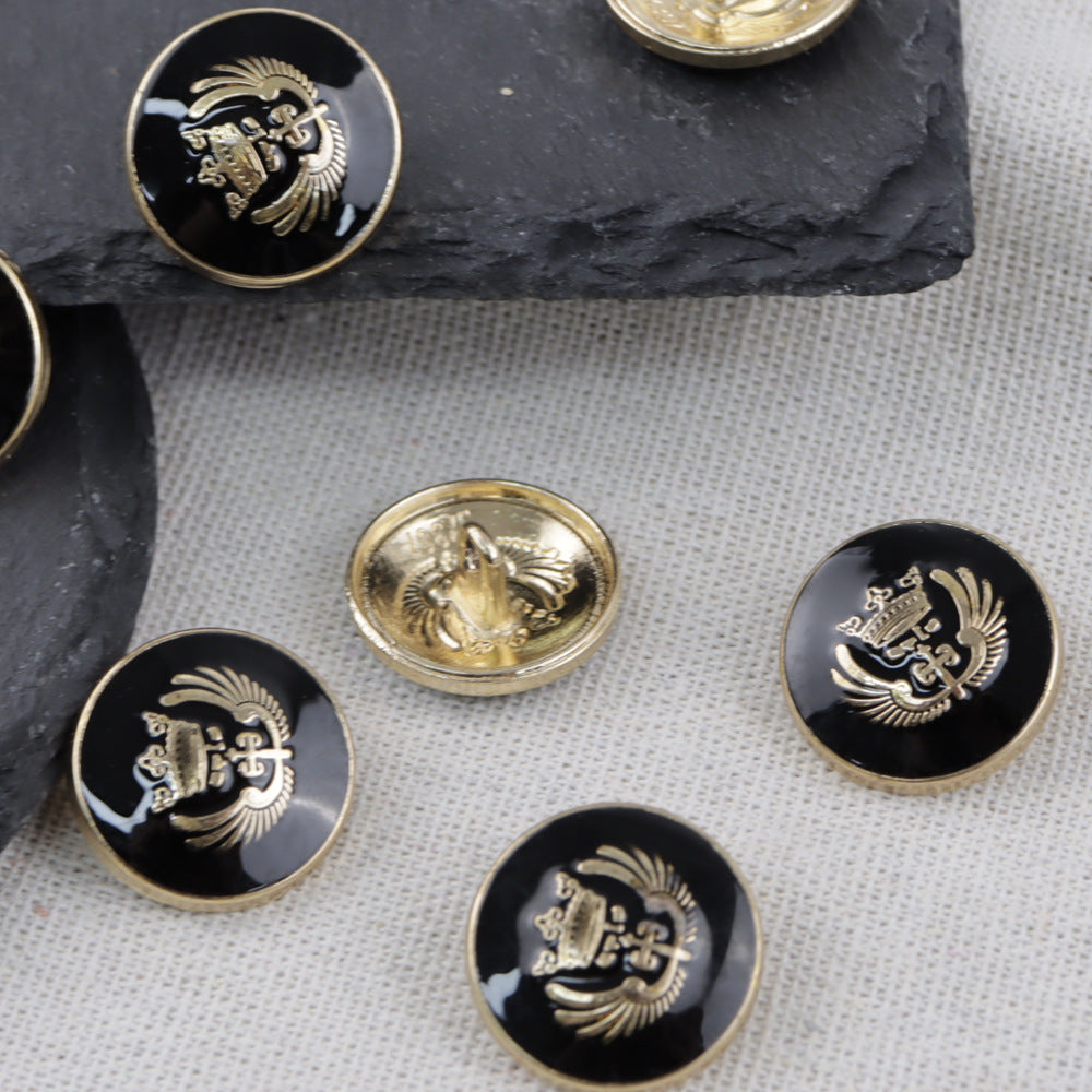 Αυτά τα κουμπιά, με μέγεθος από 11.5 έως 25mm, είναι σχεδιασμένα σε κλασικό σχήμα κορώνας και χρωματισμένα μαύρα. Είναι κατασκευασμένα από υψηλής ποιότητας μέταλλο και διαθέτουν στεφάνες, ιδανικά για ράψιμο με το χέρι σε σχολικές στολές, σακάκια και παλτά.