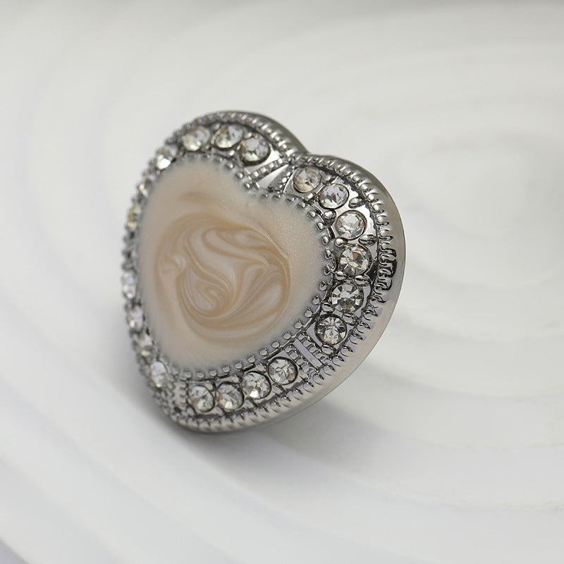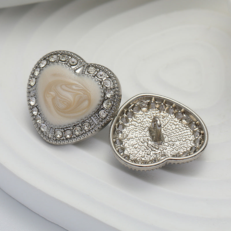 Αυτό το κοίλο μεταλλικό κουμπί σε σχήμα καρδιάς με ενσωματωμένα διαμάντια είναι ένα αληθινό έργο τέχνης. Το μαύρο και λευκό λαδωμένο φινίρισμα του δίνει μια κομψή και εκλεπτυσμένη εμφάνιση, ενώ τα λαμπερά διαμάντια προσθέτουν μια πινελιά πολυτέλειας.