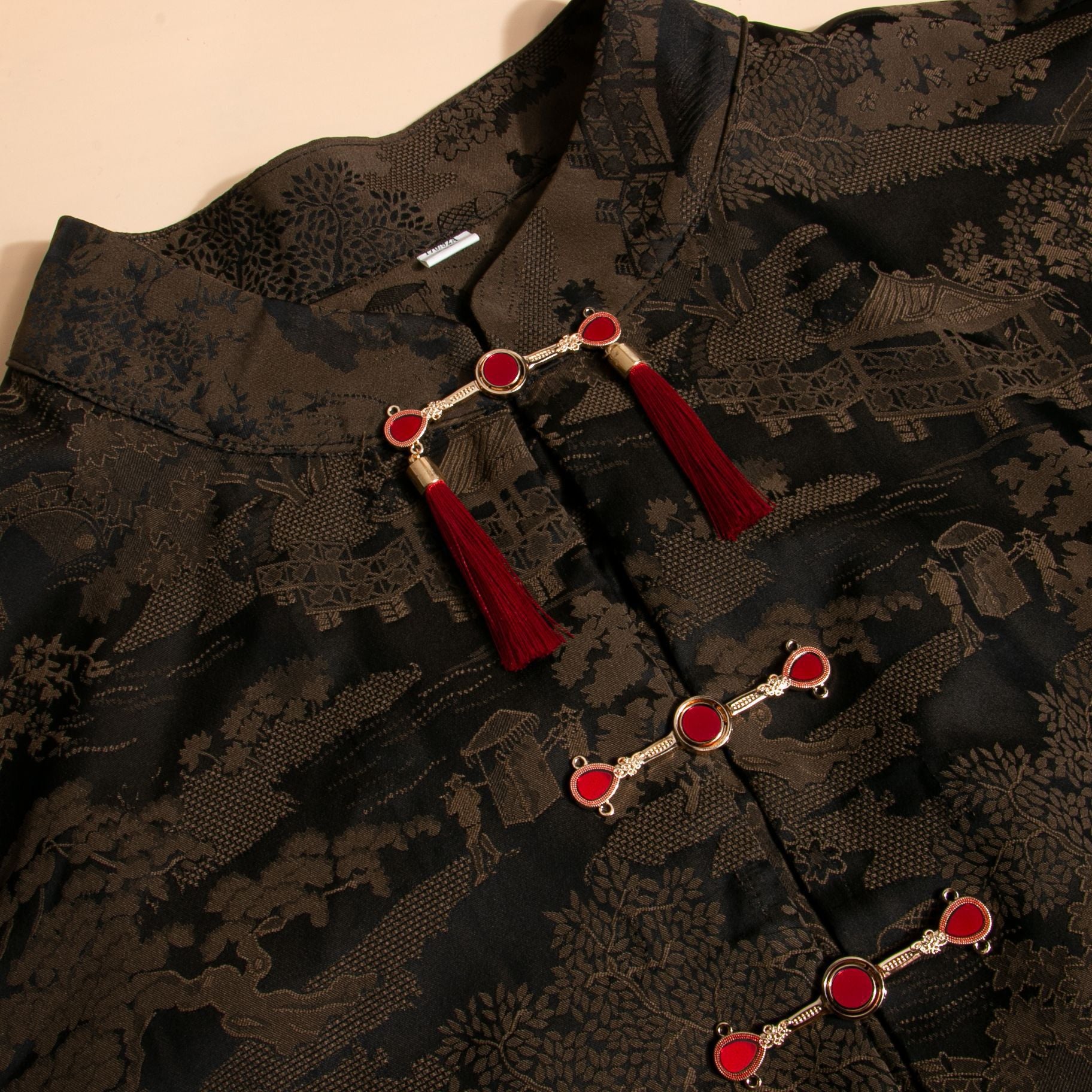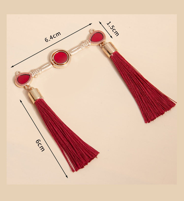 Αυτά τα κουμπιά βατράχου Hanfu μήκους 6.4cm είναι ένα αξιοσημείωτο κομμάτι της παραδοσιακής κινεζικής χειροτεχνίας. Τα κουμπιά είναι κατασκευασμένα από υψηλής ποιότητας χρυσό μέταλλο, που όχι μόνο τους δίνει μια πολυτελή και ευγενή εμφάνιση αλλά και εξασφαλίζει ανθεκτικότητα. Ο περίπλοκος σχεδιασμός των κουμπιών βατράχου αποτελεί μαρτυρία της πλούσιας πολιτιστικής κληρονομιάς της Κίνας, με κάθε καμπύλη και λεπτομέρεια να είναι προσεκτικά κατασκευασμένη. Η προσθήκη των κόκκινων φούντων στις αγκράφες ενισχύει περαιτέρω την οπτική τους γοητεία, προσθέτοντας μια πινελιά ζωντάνιας και κομψότητας. Αυτά τα κουμπιά δεν είναι μόνο λειτουργικά αλλά χρησιμεύουν και ως όμορφο διακοσμητικό στοιχείο για το Hanfu. Είναι εύκολα στην τοποθέτηση και μπορούν αμέσως να αναβαθμίσουν την συνολική εμφάνιση του παραδοσιακού κινεζικού ρουχισμού, καθιστώντας το κατάλληλο για διάφορες περιστάσεις όπως φεστιβάλ, γάμους ή πολιτιστικές εκδηλώσεις. Είτε είστε λάτρης του Hanfu είτε κάποιος που εκτιμά την ομορφιά της παραδοσιακής κινεζικής μόδας, αυτά τα κουμπιά είναι απαραίτητα για να προσθέσετε μια πινελιά αυθεντικότητας και γοητείας στην γκαρνταρόμπα σας.