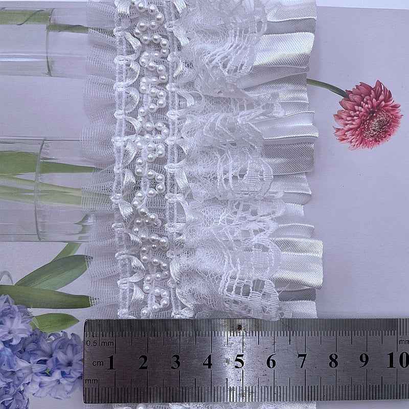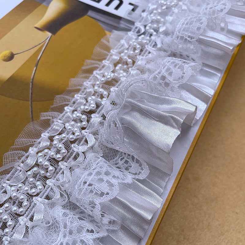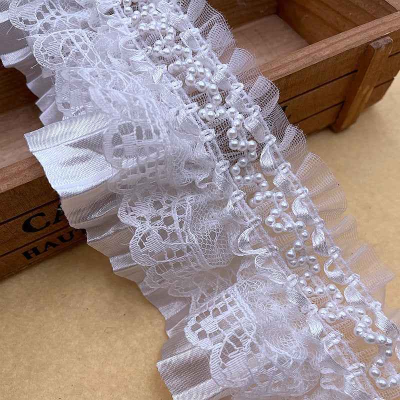 7.5cm Λευκή σατέν δαντέλα Lolita με βολάν και μαργαριταρένιες λεπτομέρειες 10 γιάρδες