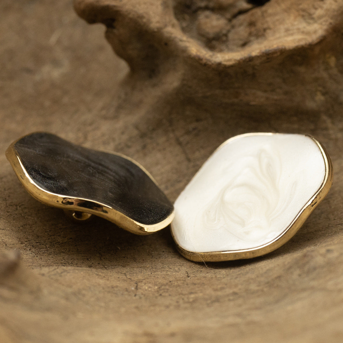 Το καμπυλωτό και ακανόνιστο σχήμα τους δίνει μια μοναδική, χειροποίητη εμφάνιση που τα ξεχωρίζει από τα παραδοσιακά κουμπιά. Προσθέτει αίσθηση κίνησης και υφής, καθιστώντας τα το επίκεντρο στο παλτό. Τα μαργαριτάρια, με τη φυσική τους λάμψη, φέρνουν μια απαλή και εκλεπτυσμένη πινελιά, ενώ η μεταλλική βάση παρέχει ανθεκτικότητα και σταθερό υπόβαθρο.