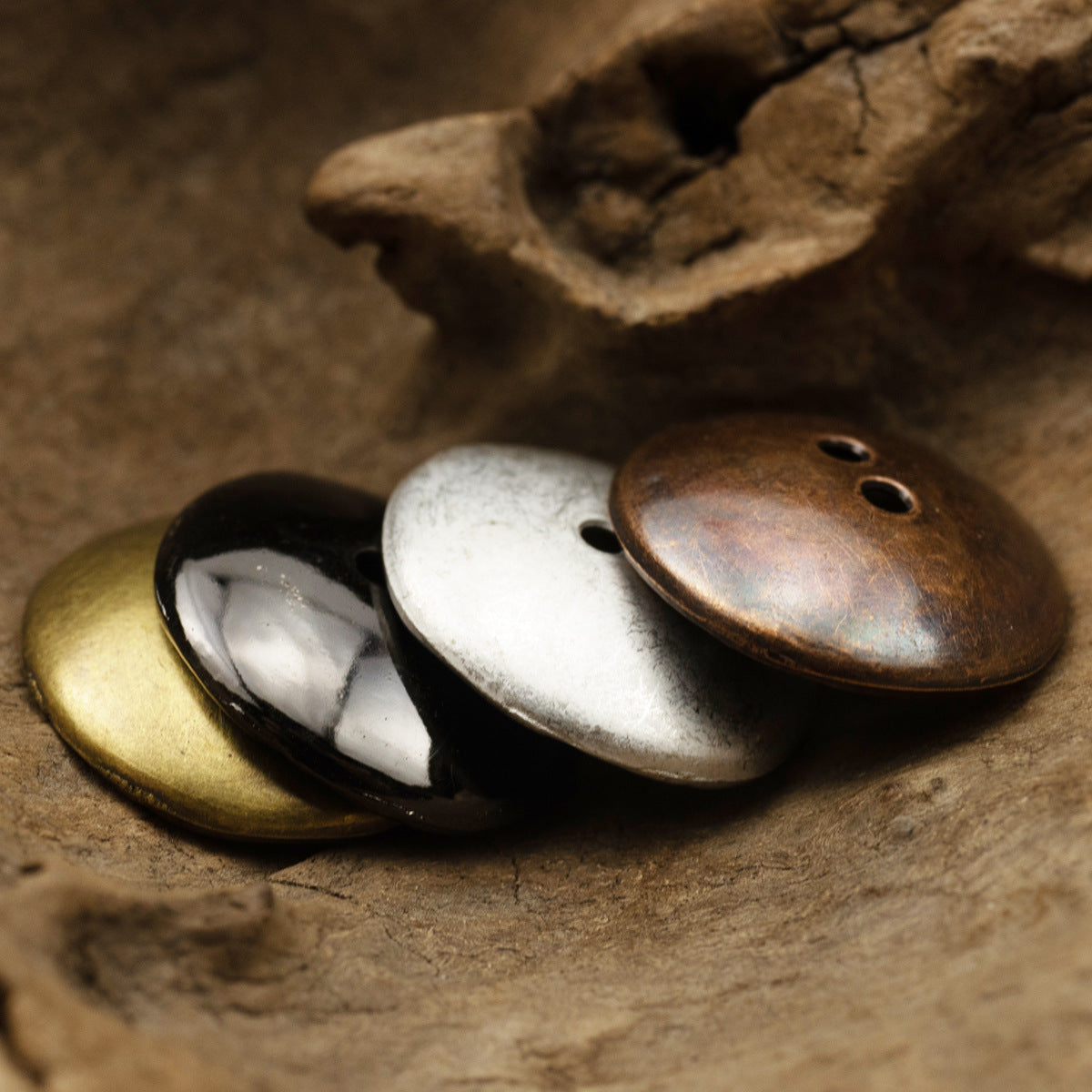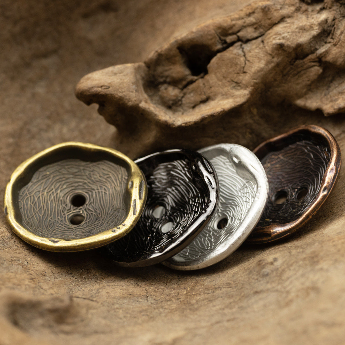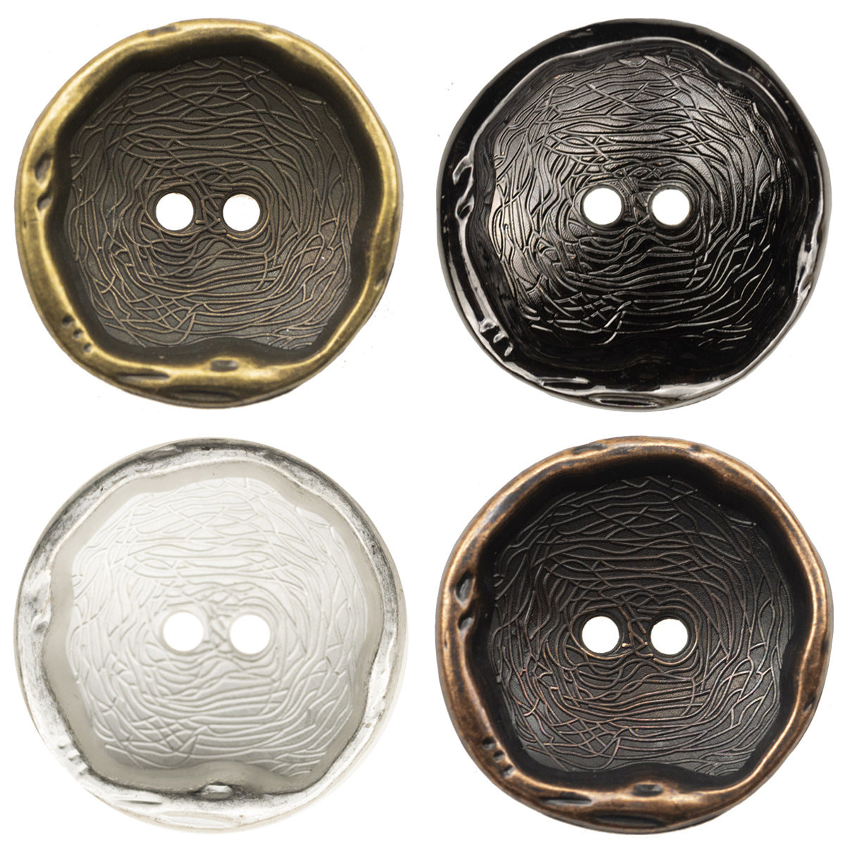 Παρουσιάζουμε τη συναρπαστική συλλογή μας από μεταλλικά κουμπιά σε ασημί-λευκό, κόκκινο μπρούντζο, μαύρο όπλου και πράσινο μπρούντζο. Αυτά τα κουμπιά διαθέτουν ακανόνιστο καμπυλωτό σχέδιο με μοναδικές γραμμές και μια μαγευτική επιφάνεια που προσθέτει μια πινελιά κομψότητας και στυλ σε κάθε ένδυμα ή αξεσουάρ.