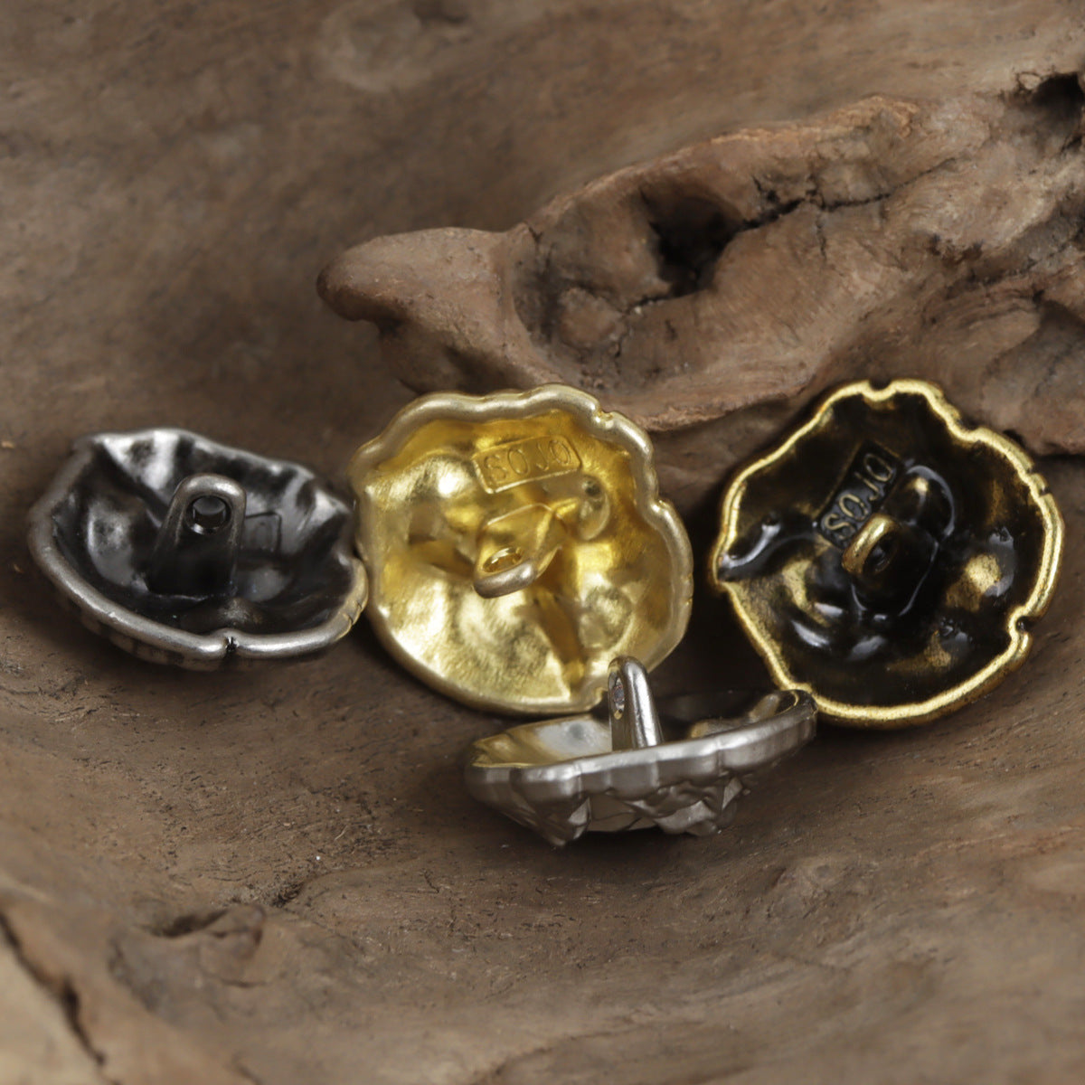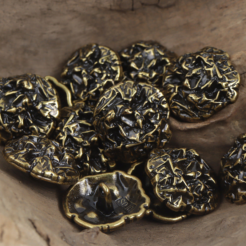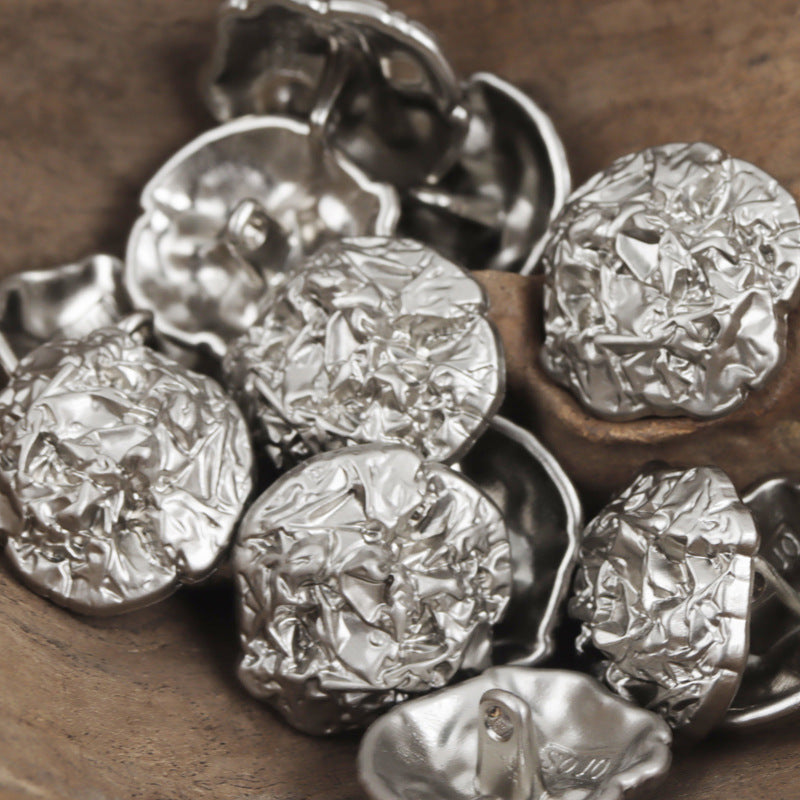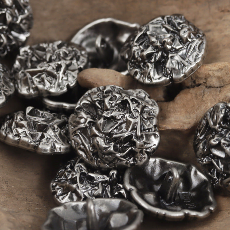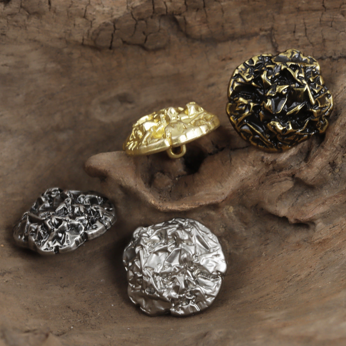 Το μεταλλικό υλικό δίνει σε αυτά τα κουμπιά μια ανθεκτική και υψηλής ποιότητας εμφάνιση. Το ακανόνιστο σχήμα και η πλισέ υφή προσθέτουν ένα στοιχείο τέχνης και ατομικότητας. Κάθε κουμπί είναι ένα έργο τέχνης, με τον δικό του ξεχωριστό χαρακτήρα.