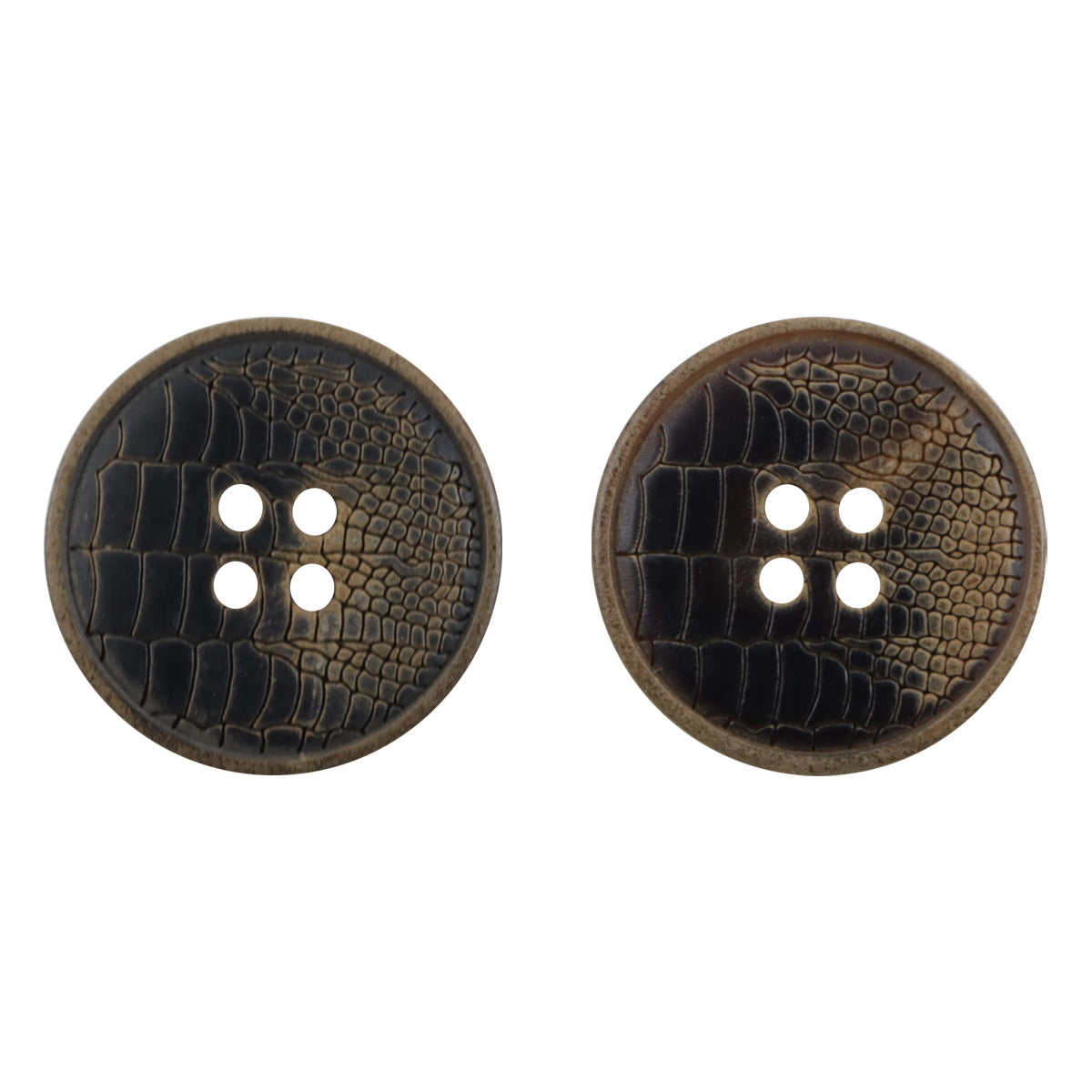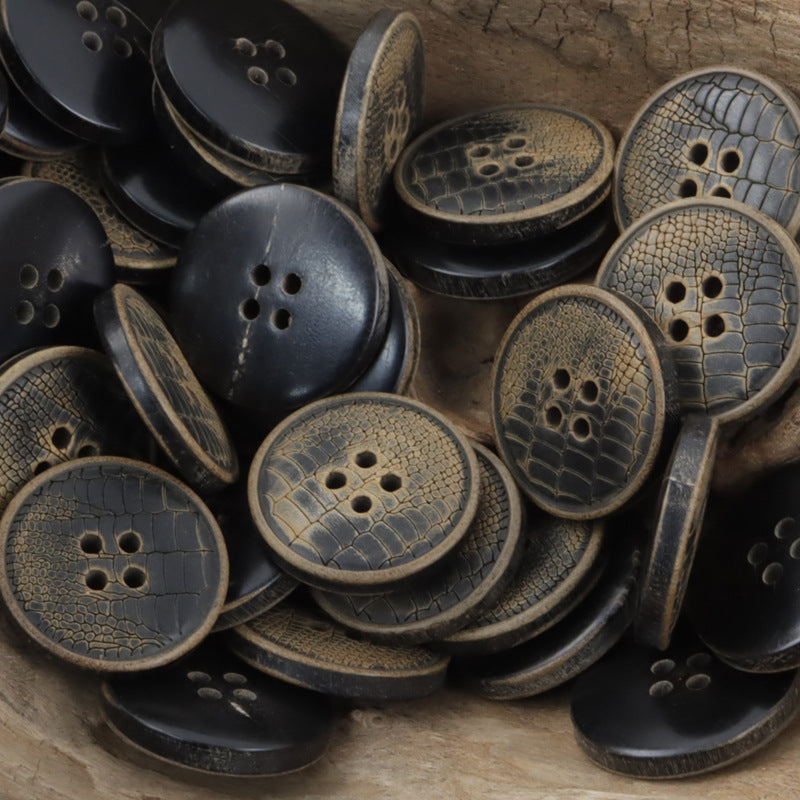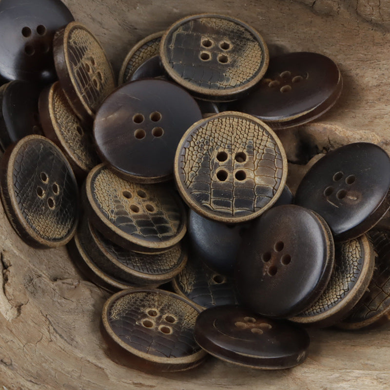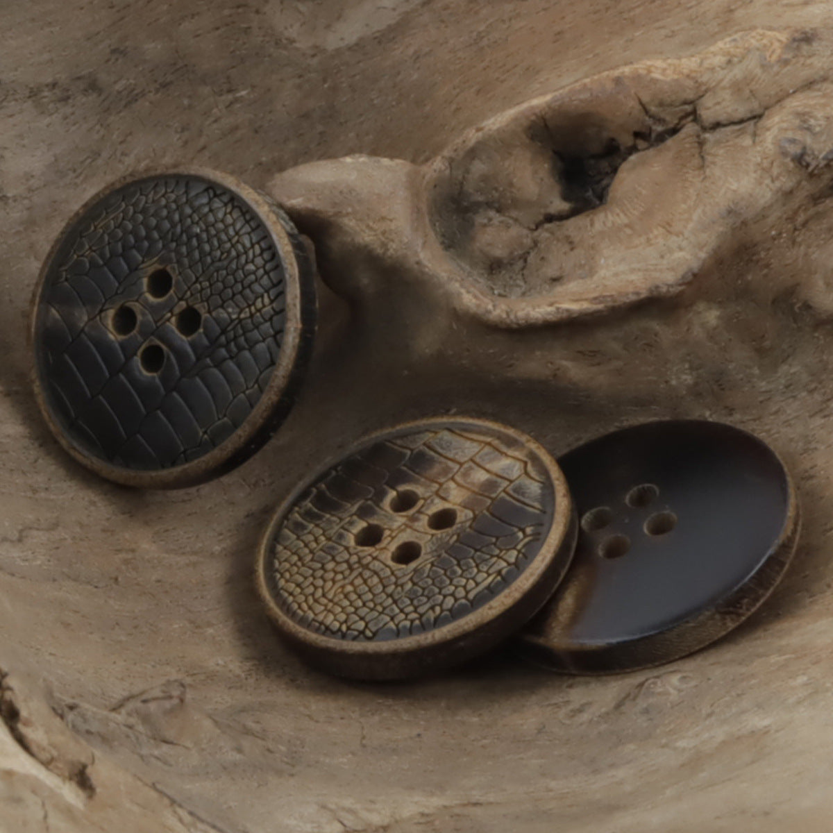 Κατασκευασμένα από γνήσιο κέρατο, αυτά τα κουμπιά δεν είναι μόνο ανθεκτικά αλλά έχουν και μοναδική υφή και εμφάνιση. Η καμένη και φθαρμένη όψη τους δίνει μια αίσθηση παλαιότητας και ρουστίκ, ενώ το σχέδιο δέρματος φιδιού προσθέτει μια πινελιά κομψότητας.