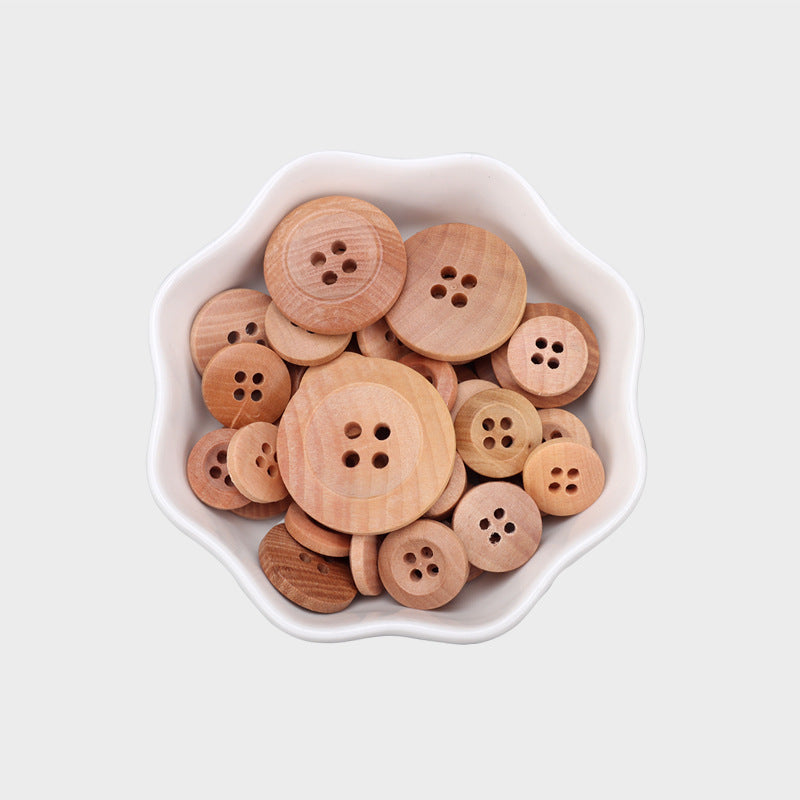 Need 11.5 - 25mm ümmargused puidust nööbid nelja auguga on valmistatud kvaliteetsest looduslikust puidust, säilitades oma algse puiduvärvi. Sile pind ja peen tekstuur annavad neile lihtsa, kuid elegantse välimuse. Ideaalne kvaliteetsetele mantlitele, trentšmantlitele ja särkidele, lisades igale riideesemele looduse ja soojust.