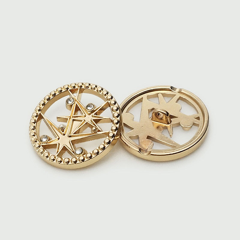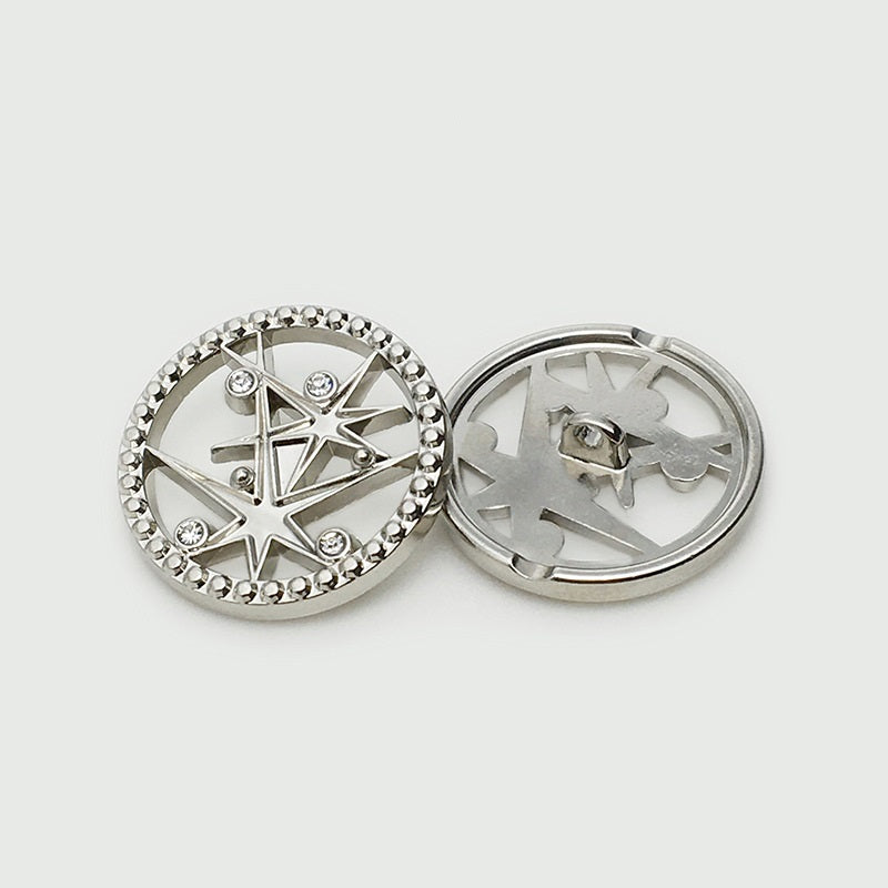 Valgustage oma riideid nende vapustavate 17.5/22.5mm metallnööpidega. Iga nööp kannab unikaalset tärni - õõnestatud ümmargust disaini, mis ühendab moodsuse ja taevaliku võlu. Hoolikalt nikerdatud tärnikujundid loovad pilkupüüdva negatiivse ruumi efekti, lisades sügavust ja põnevust.