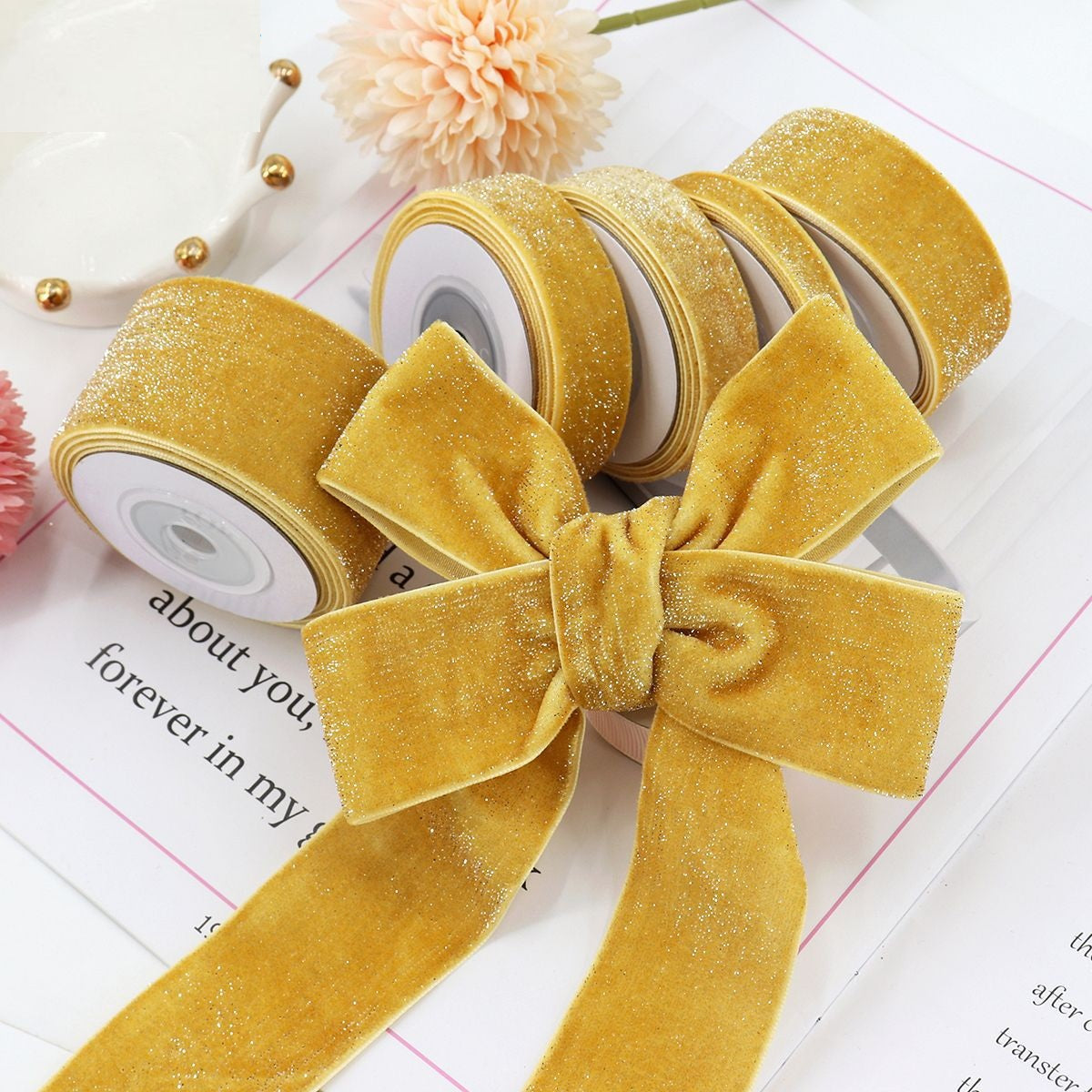 Elegantno izrađene, naše 10/16/19/25/38mm zlatne i žute baršunaste vrpce sa srebrnim detaljima savršene su za dodavanje luksuznog dodira vašim projektima. Ove vrpce imaju bogatu baršunastu teksturu i sofisticiranu paletu boja koja uključuje tople zlatne i svijetle žute nijanse, naglašene srebrnim nitima za dodatni sjaj. Idealne za umatanje poklona, izradu rukotvorina i dekorativne svrhe, ove vrpce dostupne su u različitim širinama kako bi odgovarale raznim primjenama. Njihovi žičani rubovi omogućuju lako oblikovanje u mašne i druge dekorativne oblike, što ih čini omiljenima među kreativcima i dizajnerima.