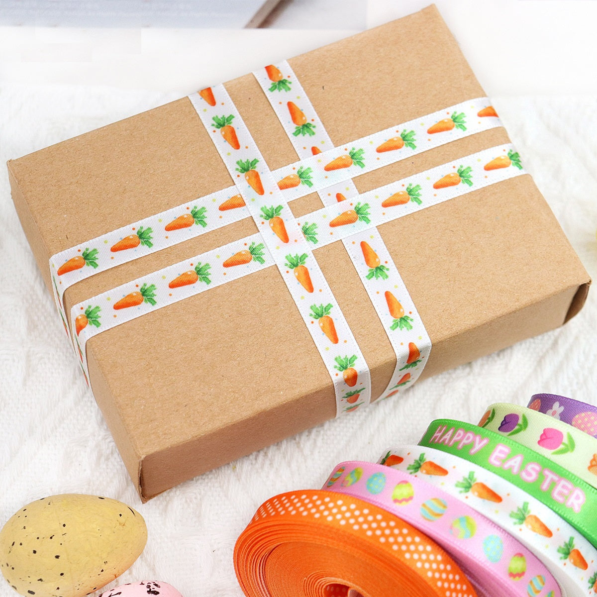 10mm uskršnja satenska vrpca - dizajn šarena jaja i male mrkvice, pakiranje od 6 komada (5 jardi po boji)