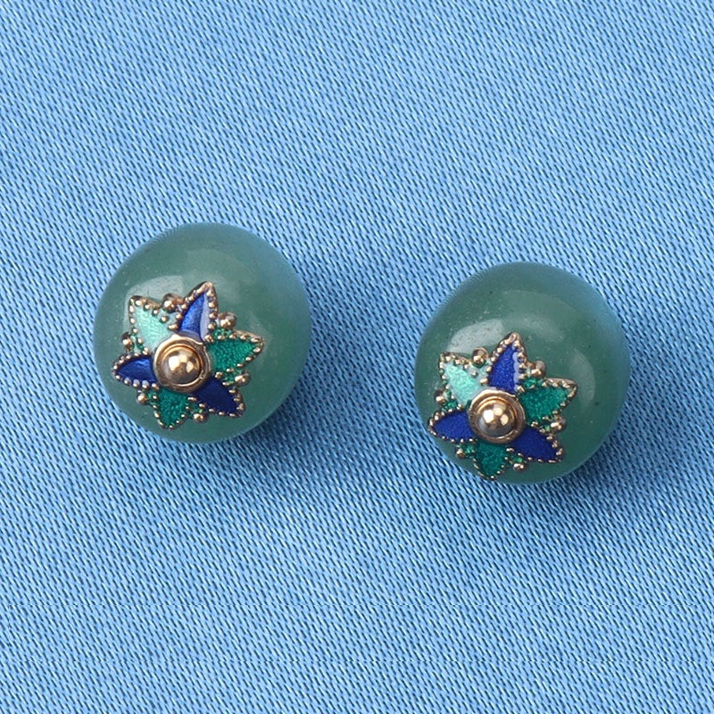 Ovi 10mm gumbi imaju zelene prirodne žad kuglice u pratnji zlatnih nosača s ukrasnim cvjetovima. Kombinacija živopisnog zelenog žada i luksuznih zlatnih naglasaka stvara vizualno zadivljujući i raskošni efekt.