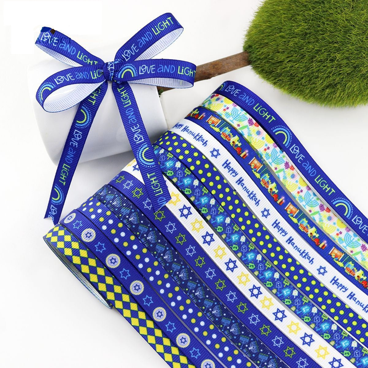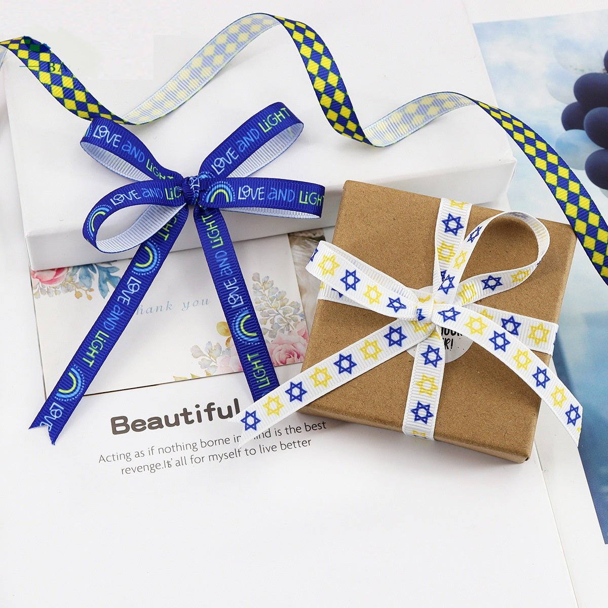 Proslavite Festival svjetlosti s našom 10mm Hanukkah vrpcom, koja sadrži ikonične simbole blagdana uključujući Zvijezdu Davidovu, menoru i dreidel. Ova vrpca je dizajnirana da unese duh Hanuke u vaš dom i poklone. Žičani rubovi omogućuju lako oblikovanje u mašne i druge ukrasne detalje, što je čini savršenom za umatanje poklona, vijence i kućni dekor. Dostupna u više duljina, ova vrpca je svestrani dodatak vašim Hanukkah proslavama, omogućujući vam da dodate svečani štih svakom projektu.