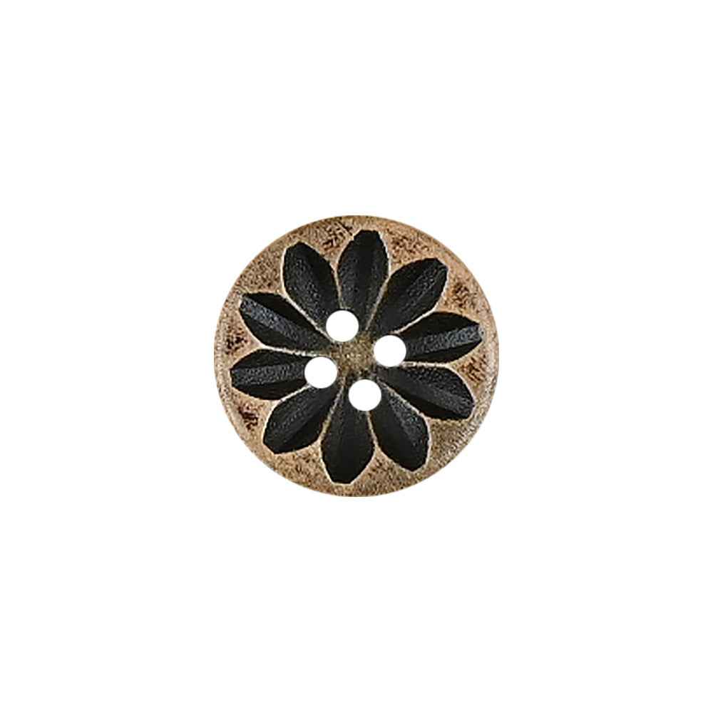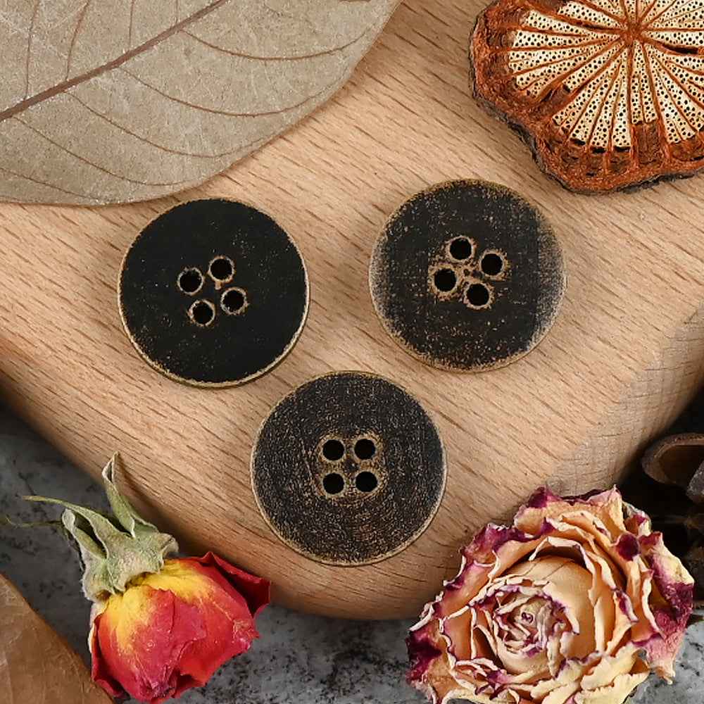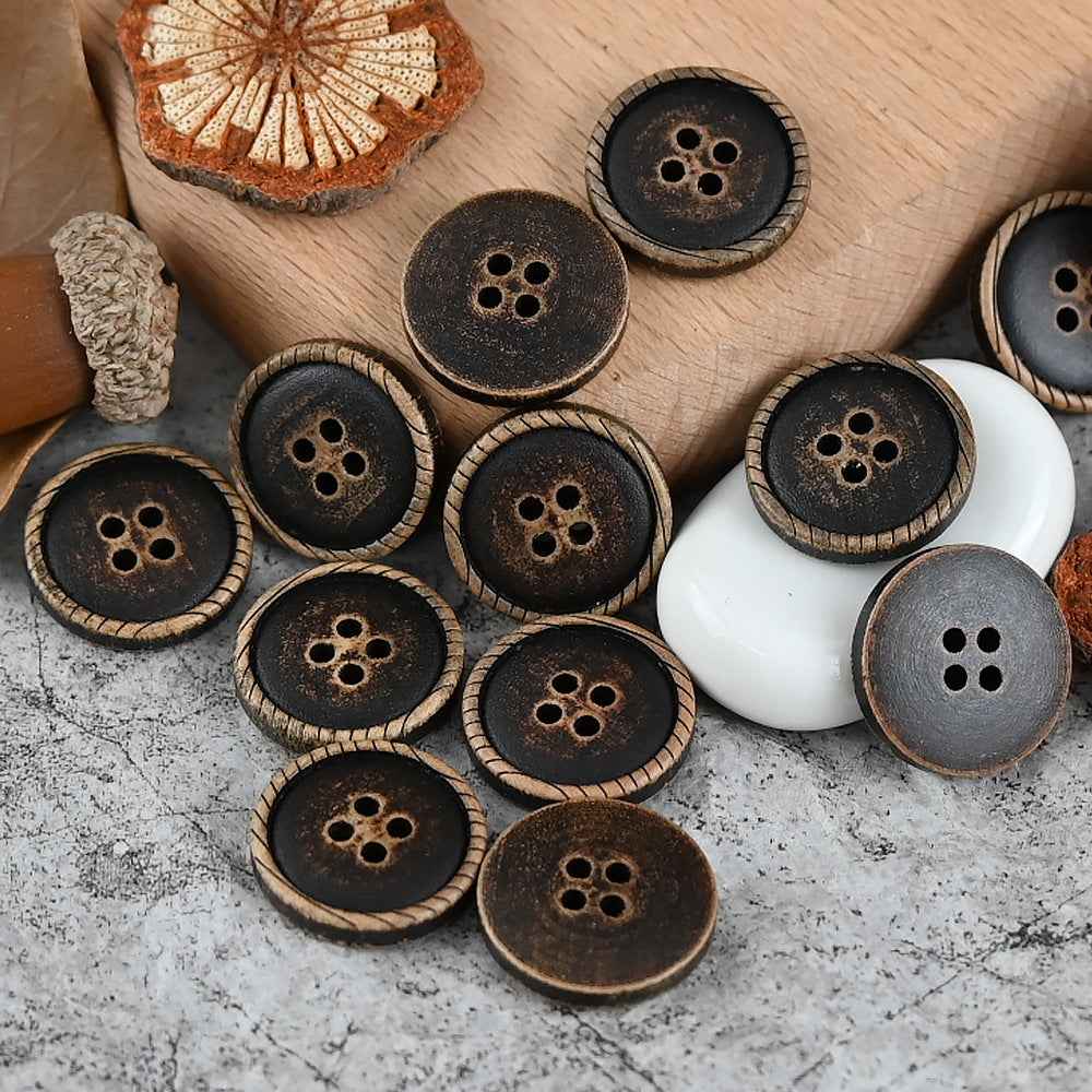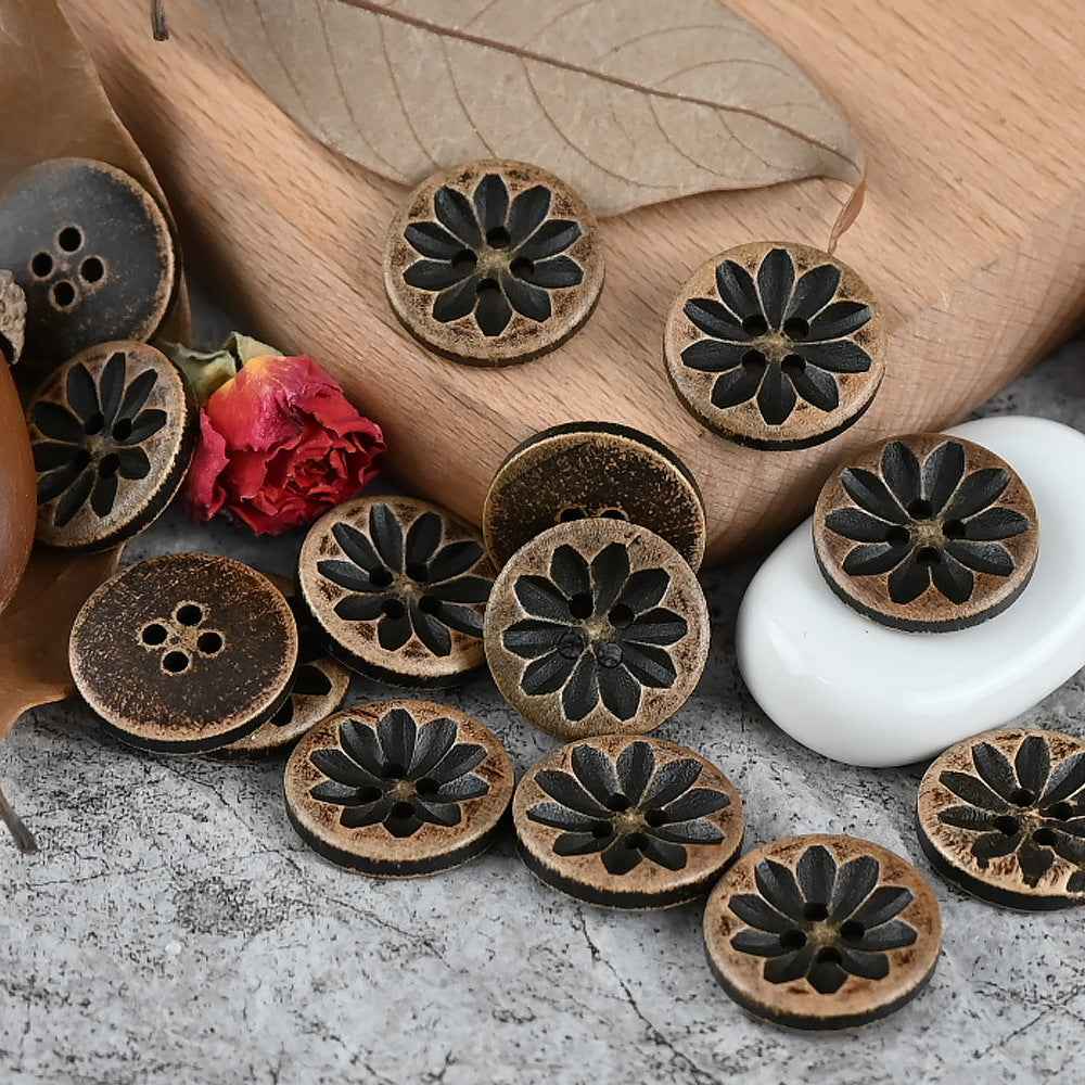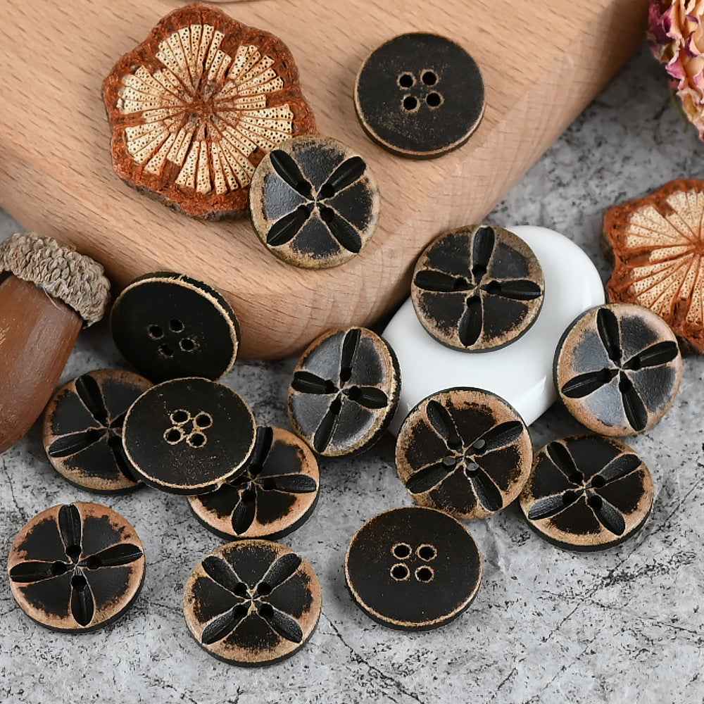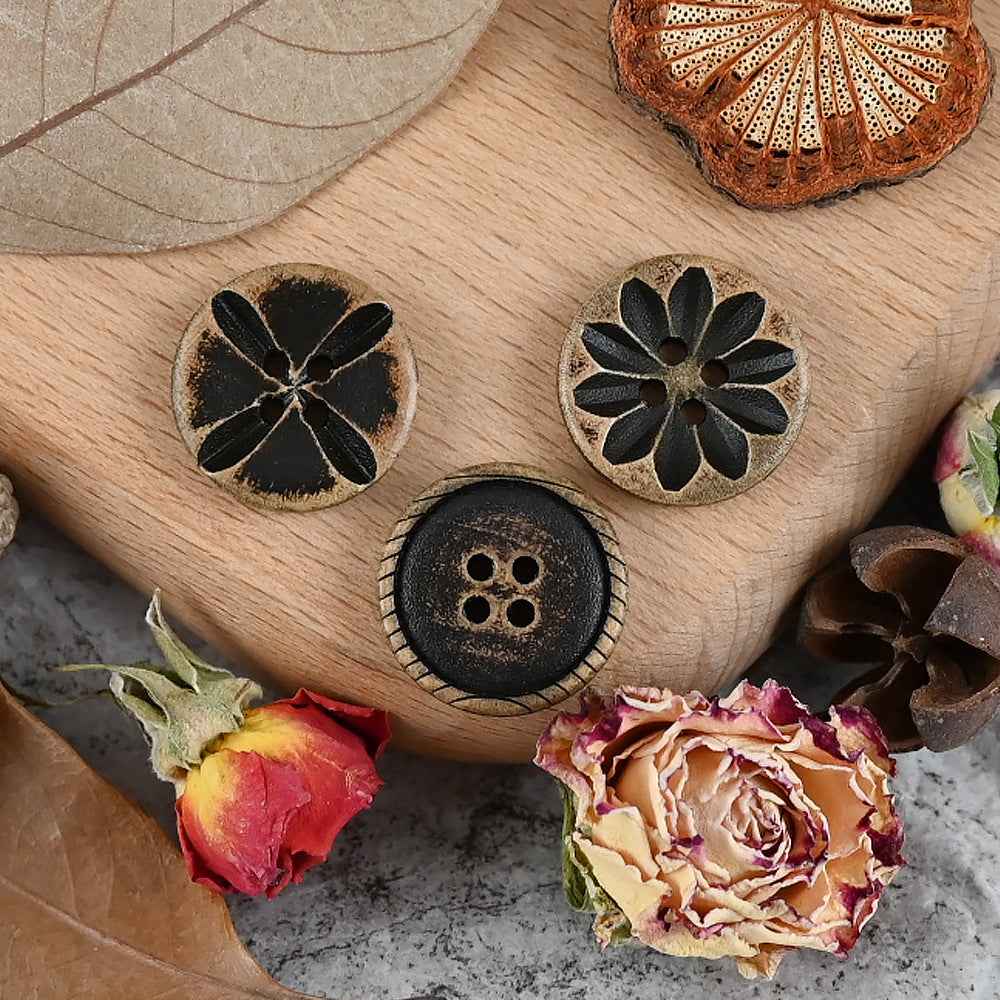 Ovi drveni gumbi, veličine od 11 do 20 mm, imaju vintage istrošen izgled postignut posebnim postupkom i dodatno su ukrašeni laserskim graviranjem. Jedinstveni dizajn čini ih izvrsnim izborom za dječju odjeću i pletene kardigane.