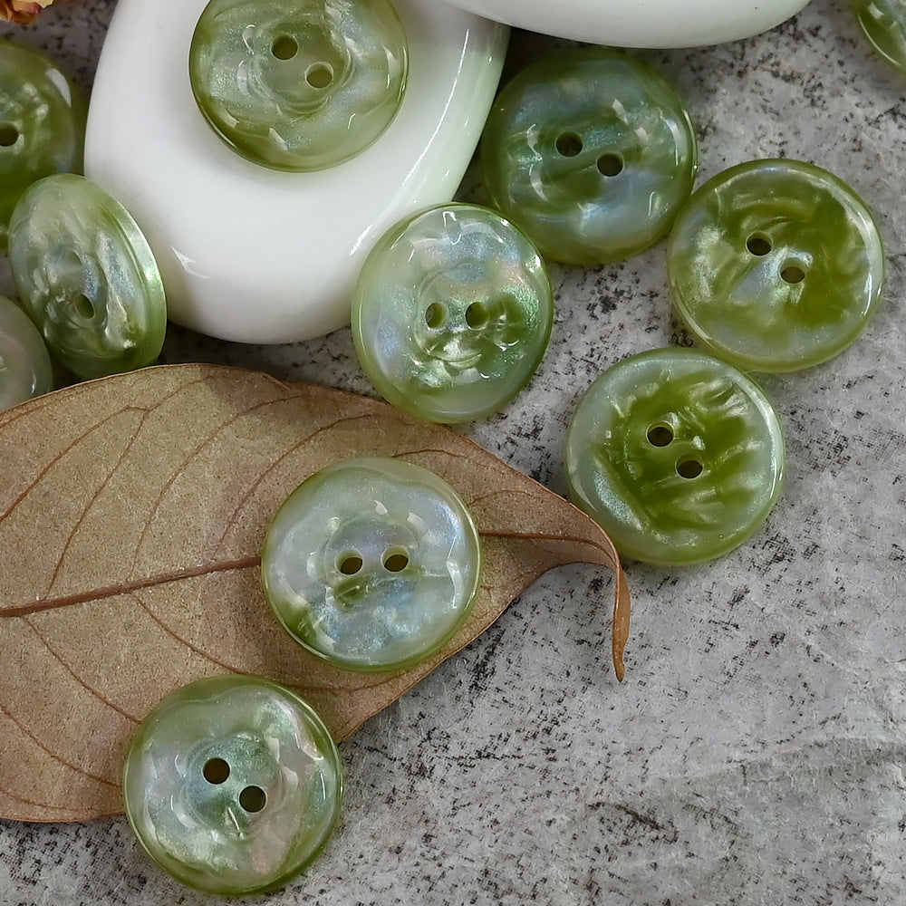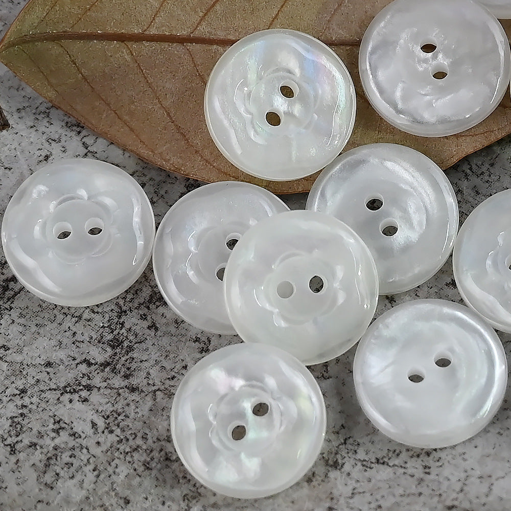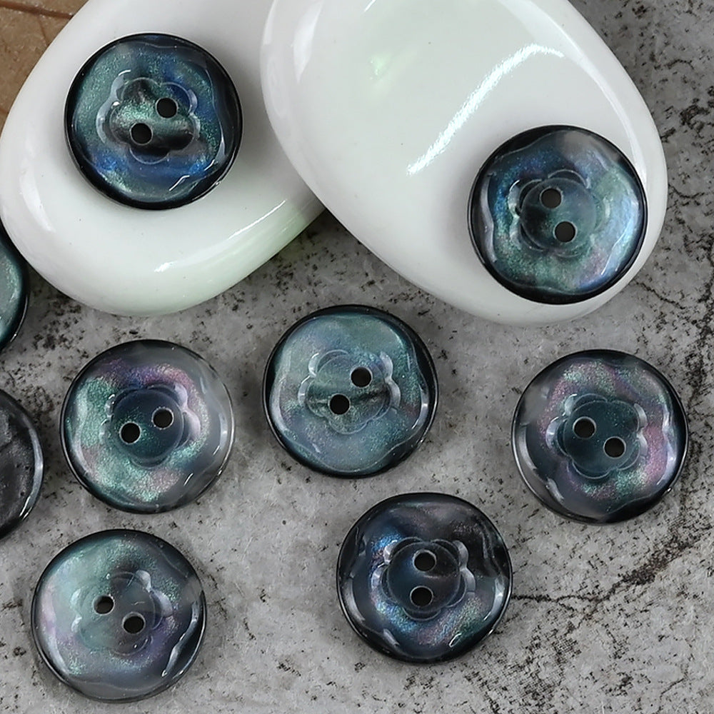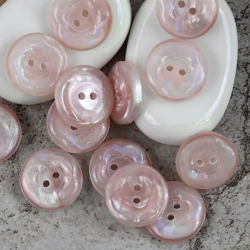 Ovi gumbi od smole, veličine 11,5 mm, 15 mm i 20 mm, dizajnirani su u prekrasnom obliku cvijeta. Jedinstvena značajka je njihov prekrasan sjajni efekt u ružičastim i plavo-ljubičastim bojama.