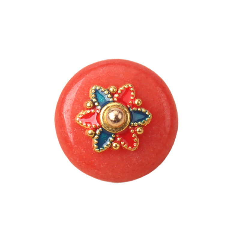 Ovi 12mm gumbi su divna fuzija narančasto-crvenog žada i zlatnih naglasaka. Živa boja žada privlači pažnju, dok zlatni držači u obliku cvijeta i ručke dodaju dašak raskoši i elegancije.