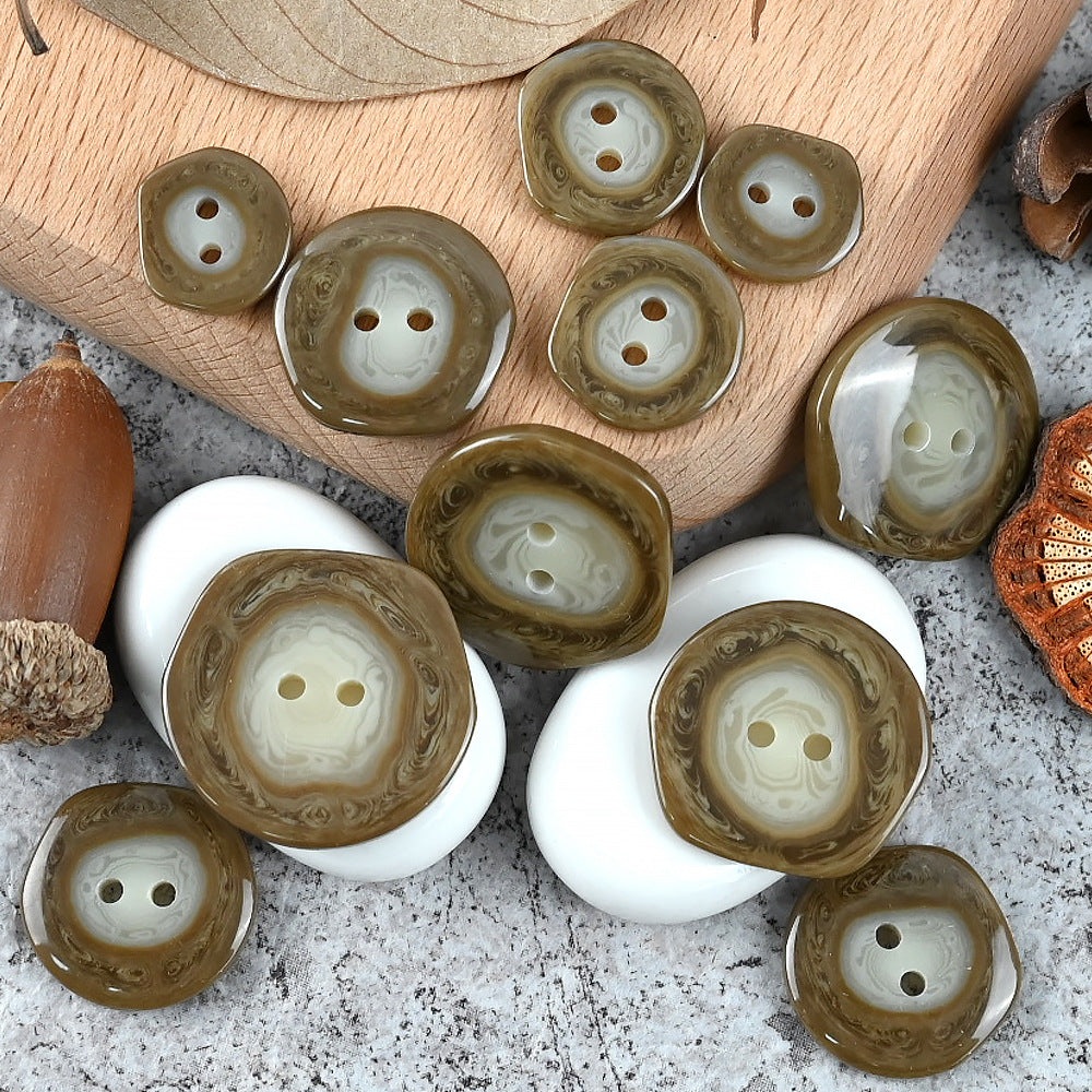 Ovi smolasti gumbi, veličine od 15 do 30 mm, imaju jedinstveni patchwork u bež i smeđim bojama u nepravilnom obliku s dva otvora. Dizajnirani su da dodaju dodir jednostavnosti i stila jesenskim i zimskim džemperima.