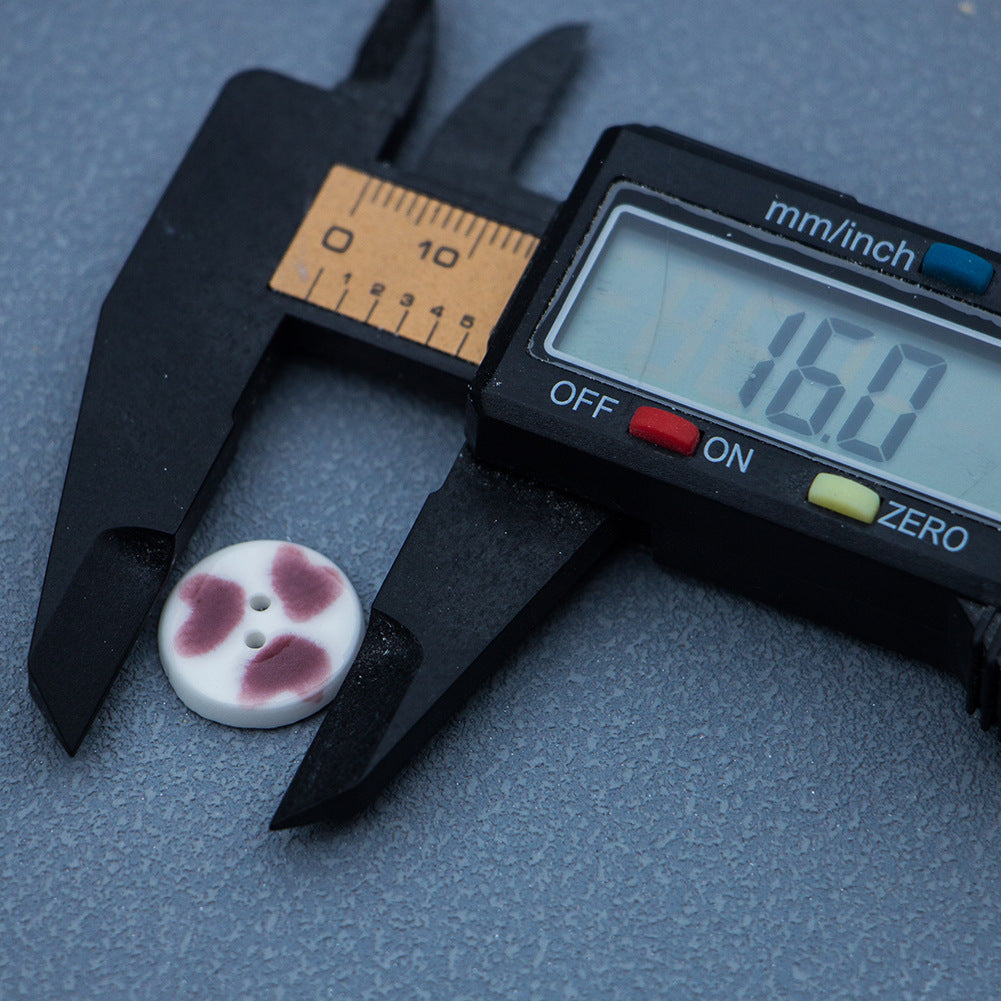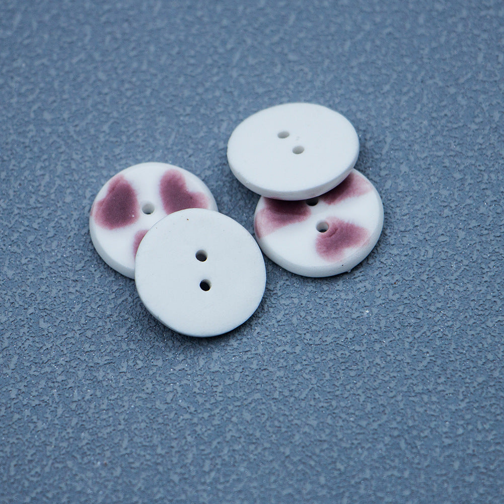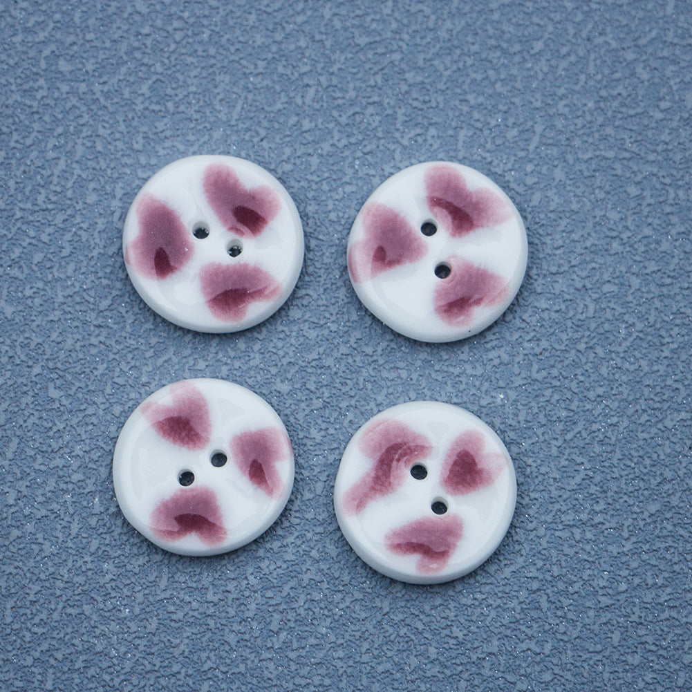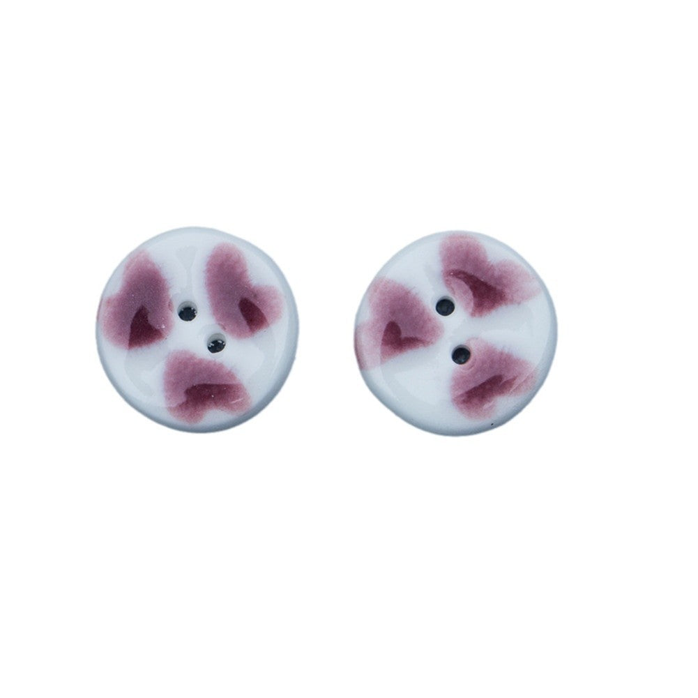 Ovi keramički gumbi promjera 16 mm šarmantan su izbor za razne DIY i šivaće projekte. Imaju okrugli oblik s dva otvora i prikazuju ručno oslikani uzorak srca u ljubičasto-crvenoj boji.