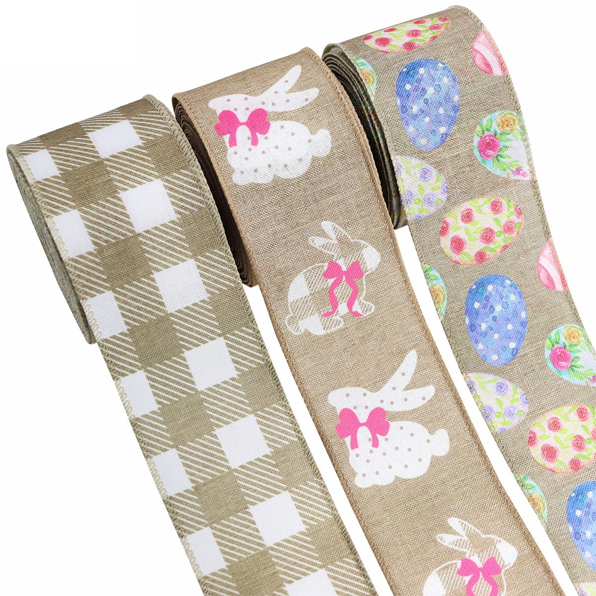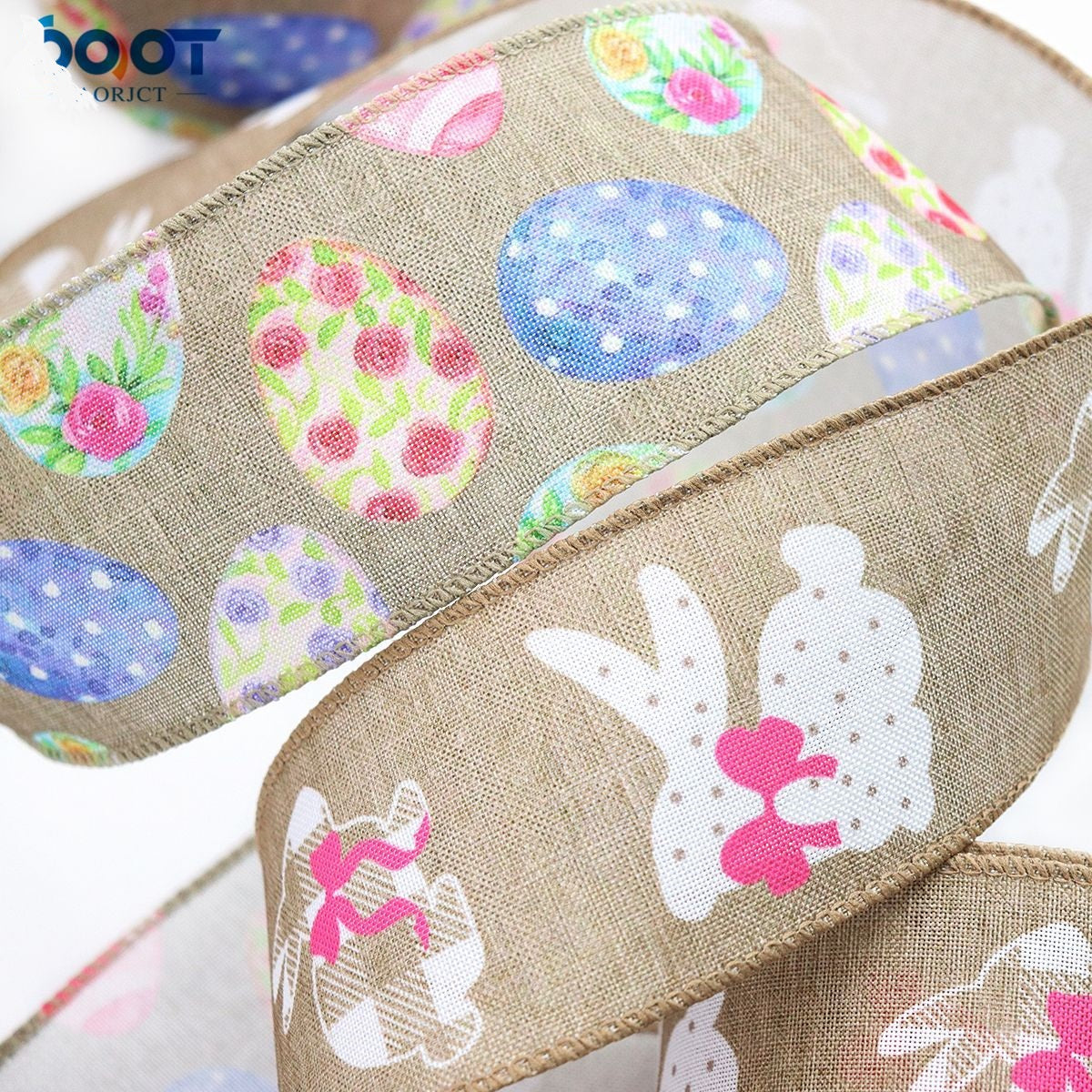 Uskrsna traka za rub širine 2,5 inča s žičanim rubom - vrpca s jajima i zečićima za proljeće, pakiranje od 12 (10 jardi po roli)