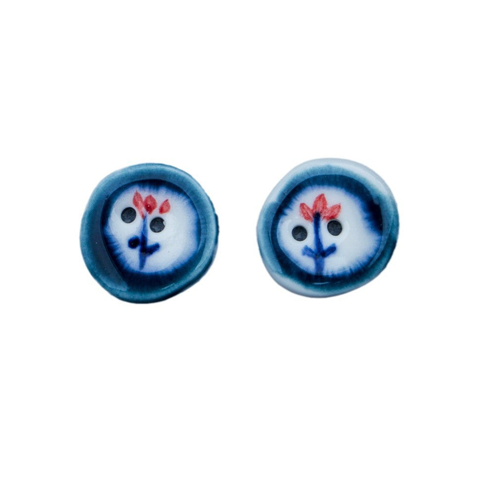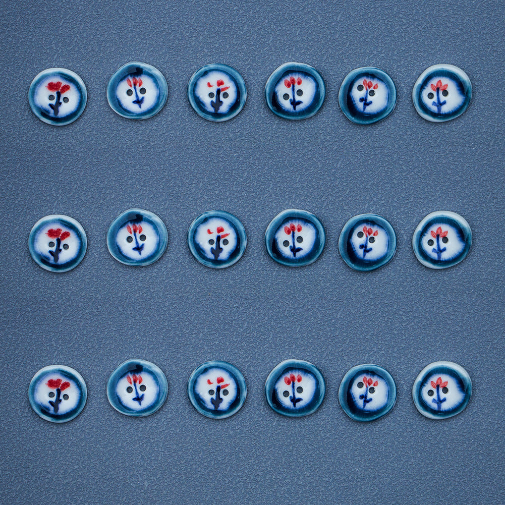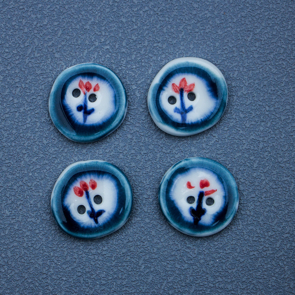 Ovi keramički gumbi promjera 20 mm šarmantan su i umjetnički dodatak svakom šivaćem ili DIY projektu. Njihov nepravilni okrugli oblik daje jedinstven i organski dojam. Gumbi su ručno oslikani prekrasnom kombinacijom tamnoplavih i živopisno crvenih cvjetova, stvarajući upečatljiv kontrast.