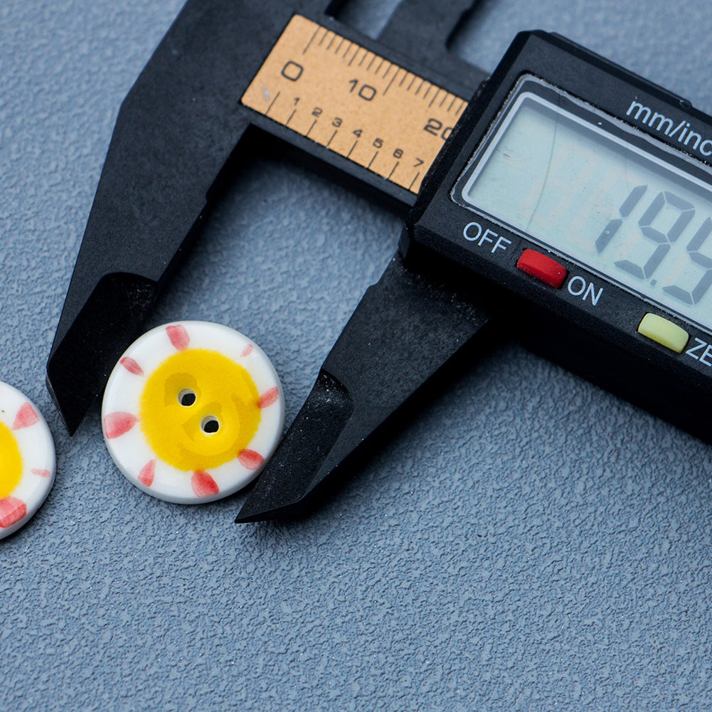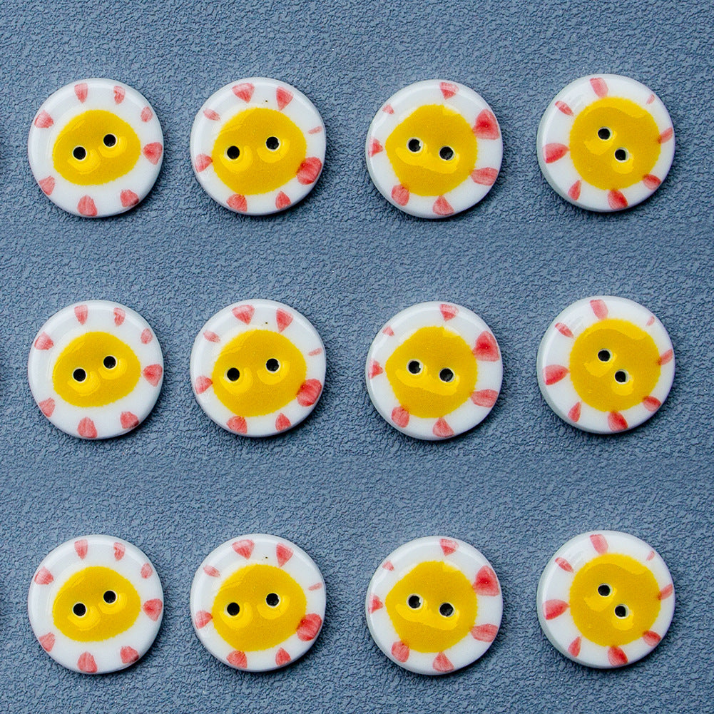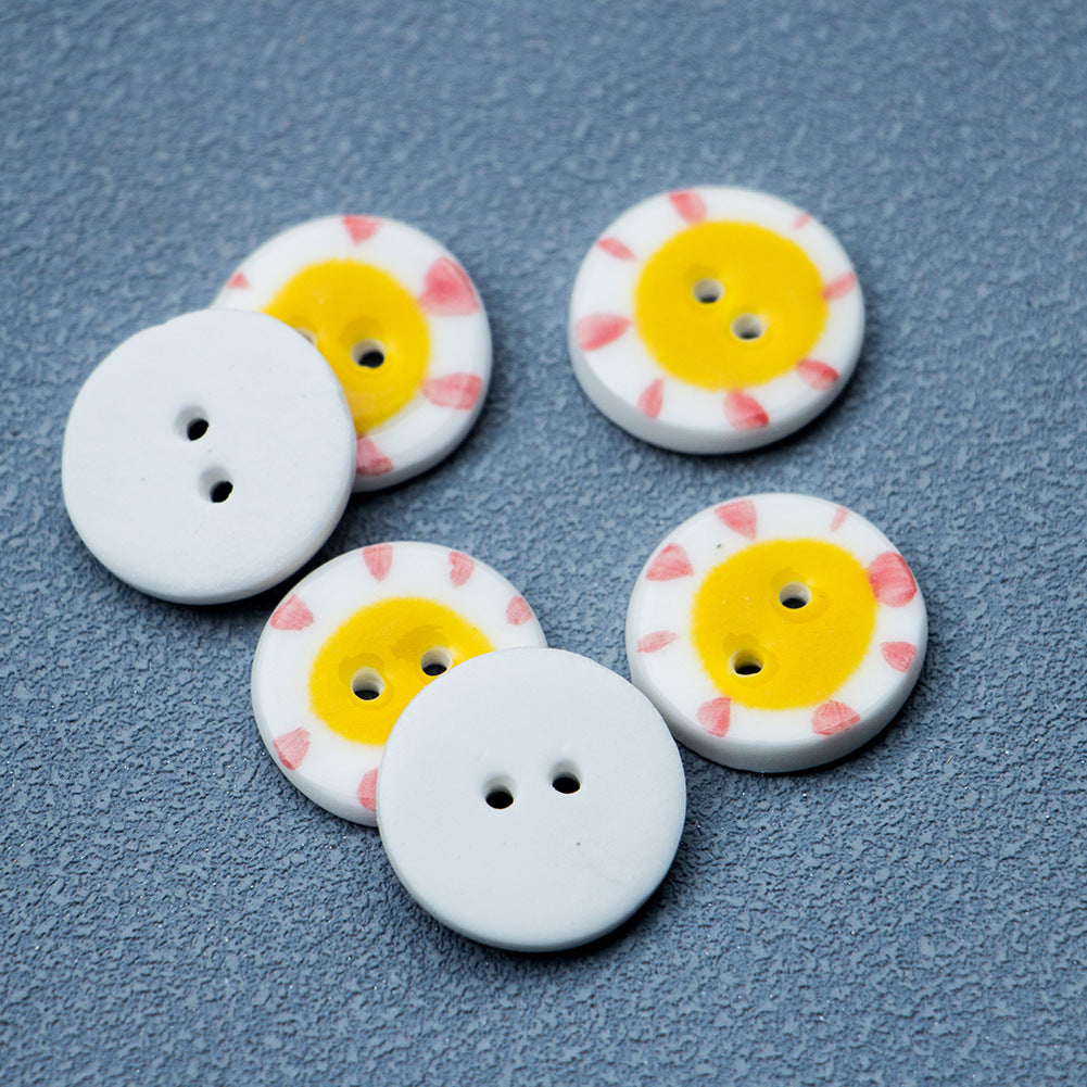 Ovi keramički gumbi promjera 20 mm su svijetao i veseo dodatak svakom kreativnom projektu. Oblikovani u savršen krug, ukrašeni su živopisnim žutim uzorkom sunca koji zrači toplinom i energijom.