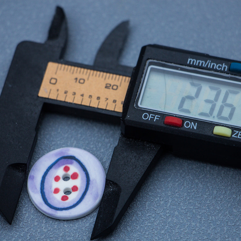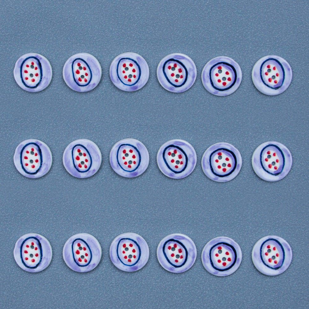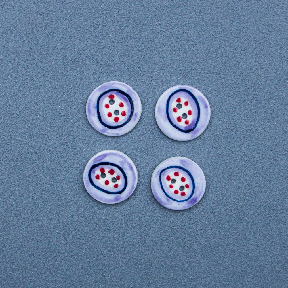 Ovi keramički gumbi promjera 24 mm jedinstvena su kombinacija tradicionalnog plavo-bijelog porculanskog stila i modernih umjetničkih elemenata. Imaju ručno oslikani dizajn s ljubičastom podlogom i šarmantnim trešnjasto crvenim točkicama, stvarajući upečatljiv kontrast.