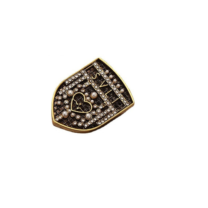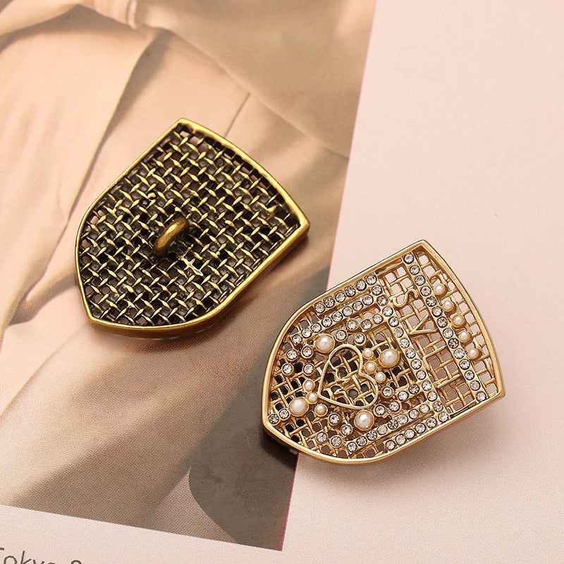 Ovaj metalni gumb u obliku štita u britanskom palačnom stilu prava je umjetnina. Ukrašen blistavim dijamantima i sjajnim biserima, odiše elegancijom i luksuzom. Složen dizajn i pažnja prema detaljima čine ga izvanrednim komadom.