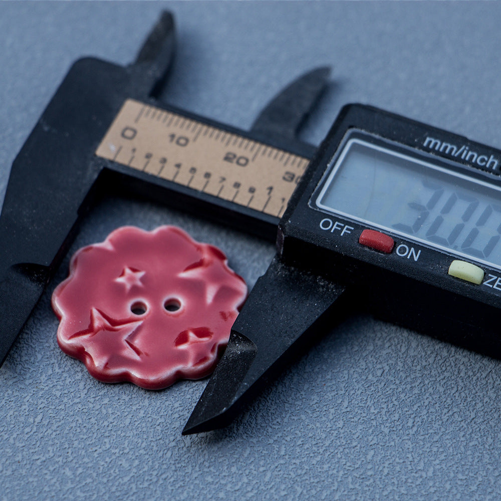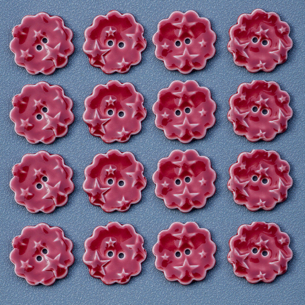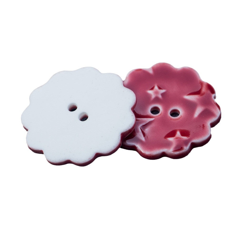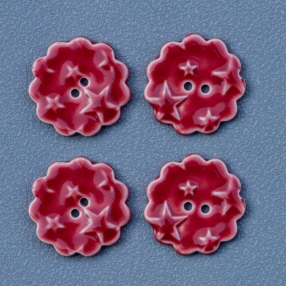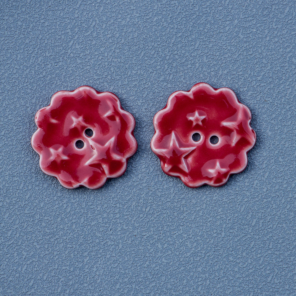 Ovi keramički gumbi promjera 30 mm su očaravajući dodatak svakom DIY ili šivaćem projektu. Gumbi su okrugli s nježnim crvenim čipkastim obrubom i istaknutim uzorkom zvijezde u sredini. Ručno izrađeni s pažnjom prema detaljima, imaju dva otvora za jednostavno pričvršćivanje.