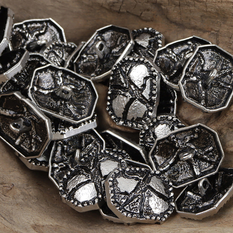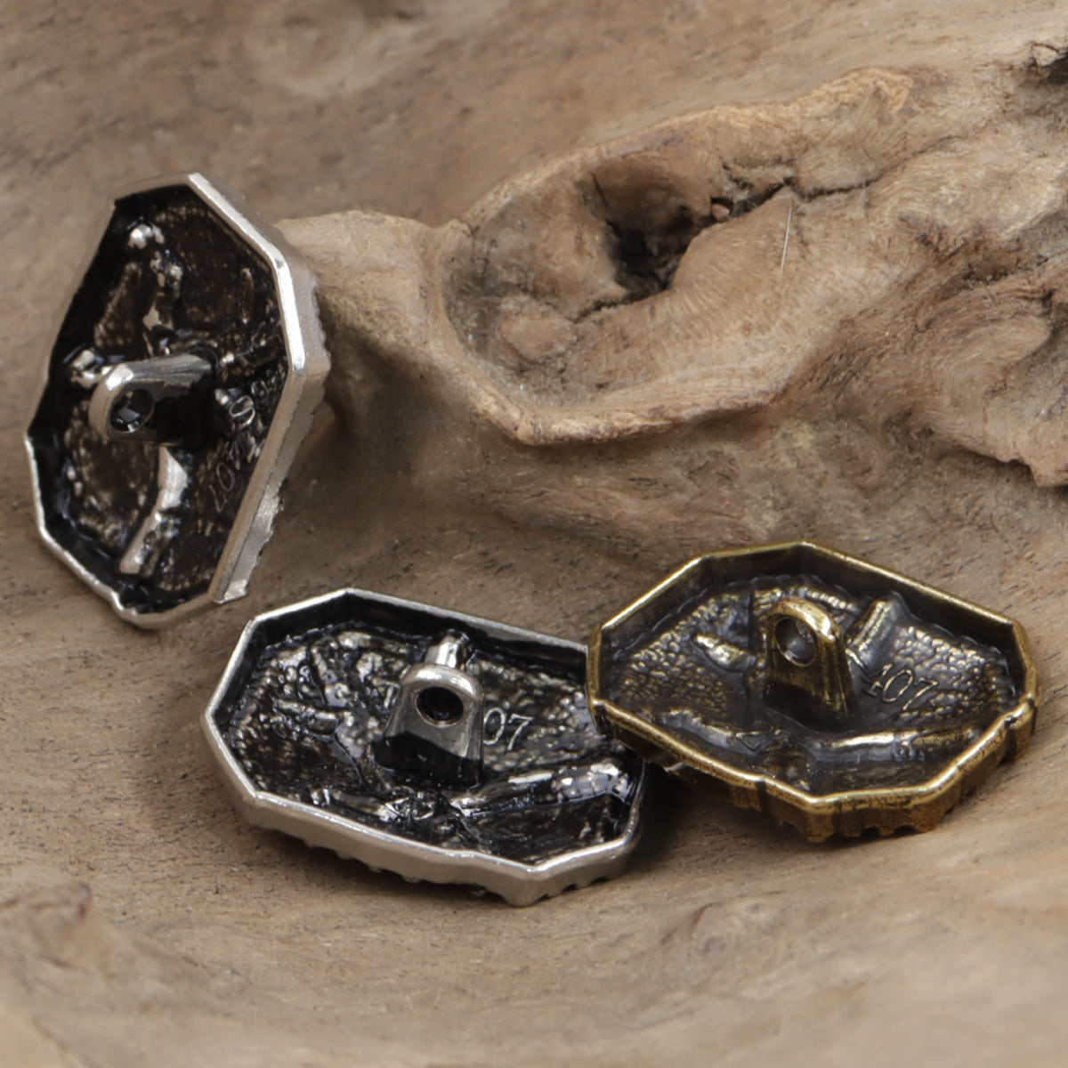 Ovi nepravilni, istrošeni, napukli srebrni i brončani metalni gumbi s crnim lakom jedinstven su i upečatljiv dodatak bilo kojem odjevnom predmetu ili modnom dodatku. Kombinacija srebrnih i brončanih tonova, zajedno s crnim lakiranim završetkom, daje ovim gumbima antikni i oštri izgled.