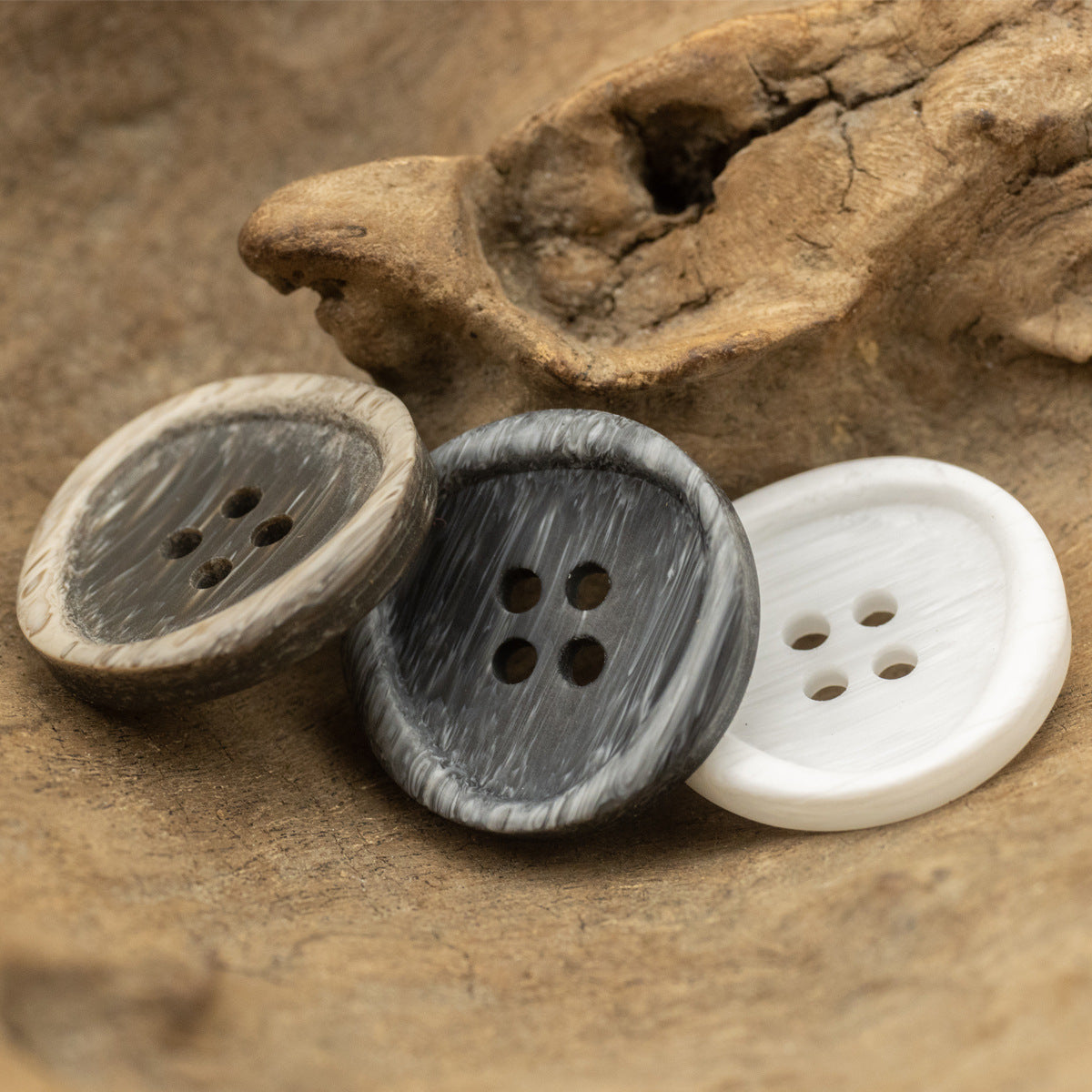 Izrađeni od visokokvalitetne smole, ovi gumbi su izdržljivi i dugotrajni. Smola je izvrstan materijal za gumbe jer može izdržati habanje i izlaganje različitim uvjetima okoliša. Također je jednostavna za čišćenje i održavanje, osiguravajući da gumbi zadrže svoj atraktivan izgled tijekom vremena. Materijal od smole omogućuje precizno repliciranje uzorka imitiranog drvenog zrna i nepravilnog oblika.