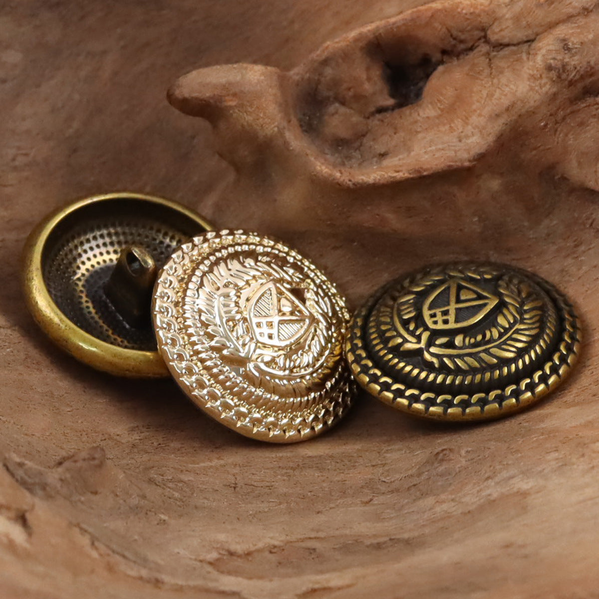 Izrađeni od visokokvalitetnog metala, imaju izdržljivu i čvrstu konstrukciju koja osigurava dugotrajnu upotrebu. Detaljan dizajn sadrži istaknut štit u sredini, simbolizirajući zaštitu i čast, što je uobičajeni motiv u tradicionalnim grbovima. Oko štita su prekrasno izrađene uši pšenice, koje predstavljaju plodnost, obilje i povezanost s prirodom. Ova kombinacija daje gumbima jedinstven i šarmantan izgled koji je istovremeno kraljevski i zemljani.