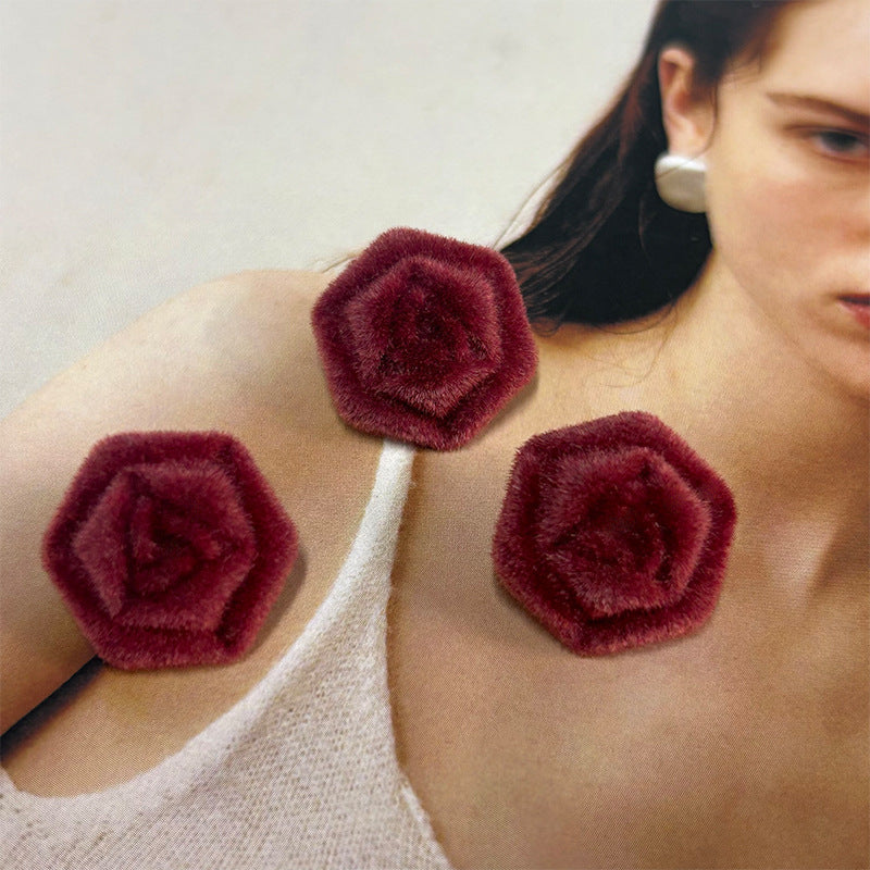 Ovi metalni gumbi veličine 18/23 mm imaju jedinstveni šesterokutni oblik s prekrasnim uzorkom ruže u angora crvenoj boji. Pospana površina daje im mekan i luksuzan osjećaj. Savršeni su za poboljšanje izgleda kašmir kaputa i vunenih jakni. Kombinacija bogate boje, elegantnog uzorka ruže i pospane završne obrade čini ove gumbe upečatljivim detaljem. Izrađeni od visokokvalitetnih materijala i finog majstorstva, ne samo da imaju dekorativnu funkciju, već dodaju i dozu sofisticiranosti i profinjenosti svakom vanjskom odjevnom predmetu, čineći ga stiliziranijim i upečatljivijim.