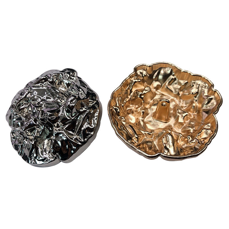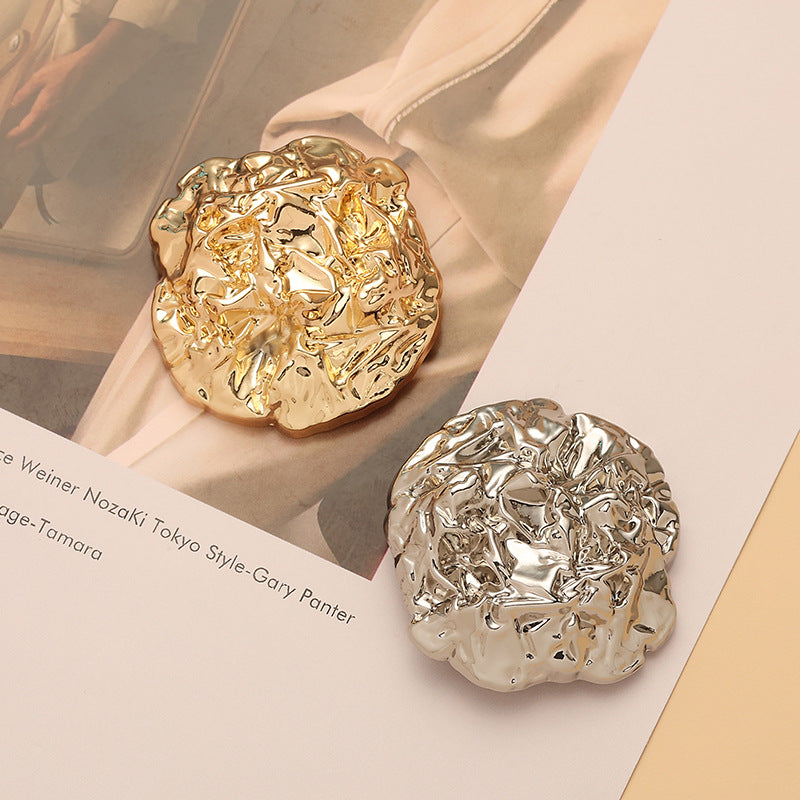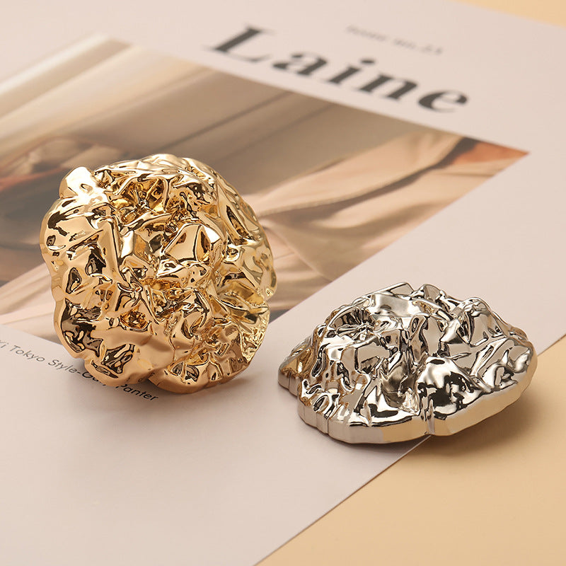 Ovaj jedinstveni nepravilnog oblika, naborani, kamenoliki metalni ručno šivani gumb s petljom prava je umjetnina. Metalni gumb je izrađen da nalikuje prirodnom kamenu sa svojom teksturiranom i naboranom površinom, dajući mu organski i zemljani osjećaj. Petlja dodaje praktičan dodir, olakšavajući pričvršćivanje i dajući mu prepoznatljiv izgled. Savršen za dodavanje rustikalnog šarma jaknama, kaputima, bluzama ili čak dodacima poput torbi i šešira. Metalna konstrukcija osigurava izdržljivost i dugotrajnu upotrebu. Bilo da je za boemski inspiriranu odjeću ili tradicionalniji izgled s dozom originalnosti, ovaj gumb sigurno će privući pažnju.