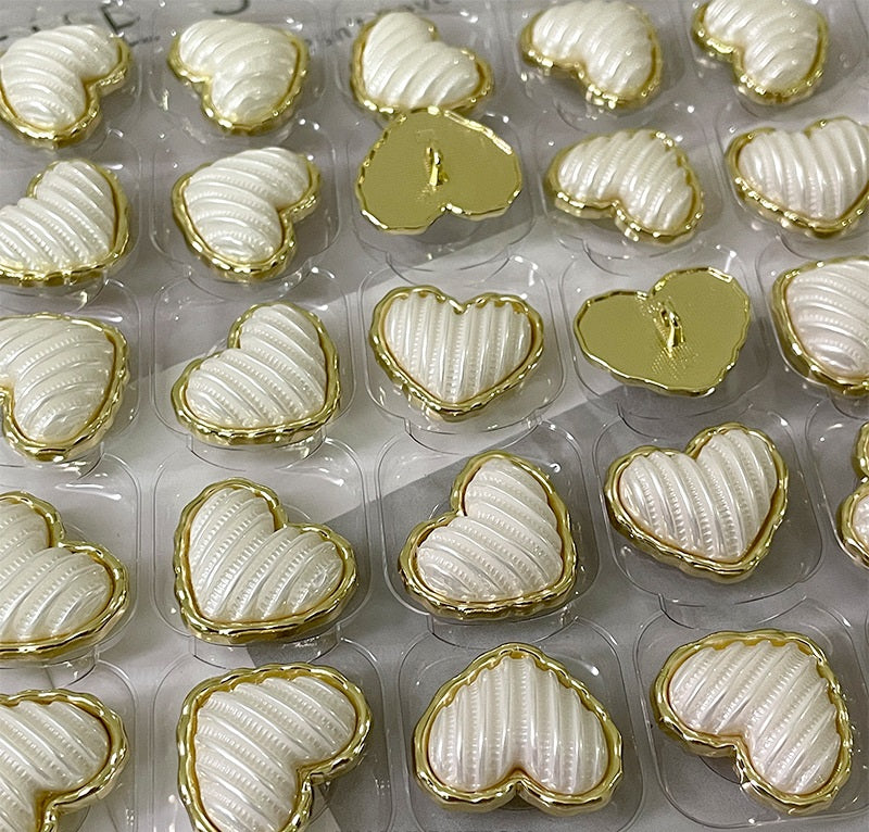 Disse 18/23mm knappene er laget av legering, med en herlig kjærlighetsform. Kombinasjonen av gull- og hvitfarger skaper en slående og sofistikert to-tonet effekt. Knapper med shank gjør dem praktiske for feste til frakker. Deres høykvalitets legeringskonstruksjon sikrer holdbarhet og en glitrende finish. De oppfyller ikke bare den praktiske funksjonen av å feste, men fungerer også som sjarmerende dekorative elementer. De kan tilføre et preg av eleganse og sentimentalitet til enhver frakk, enten det er en formell eller uformell stil, og forbedre den overordnede estetikken og få plagget til å skille seg ut.