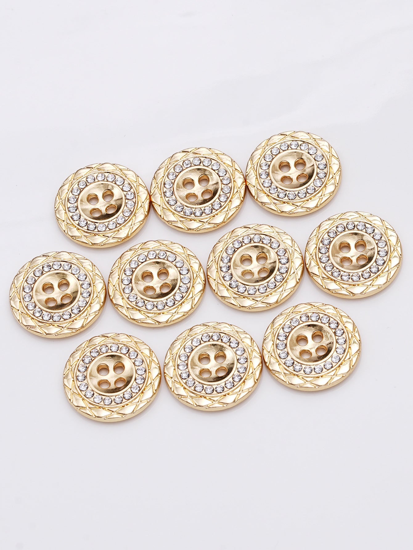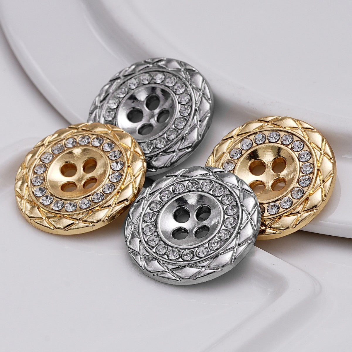 Design: Round shape with four holes and embedded rhinestones for refined glamour