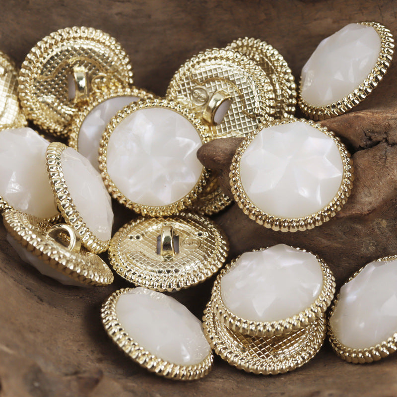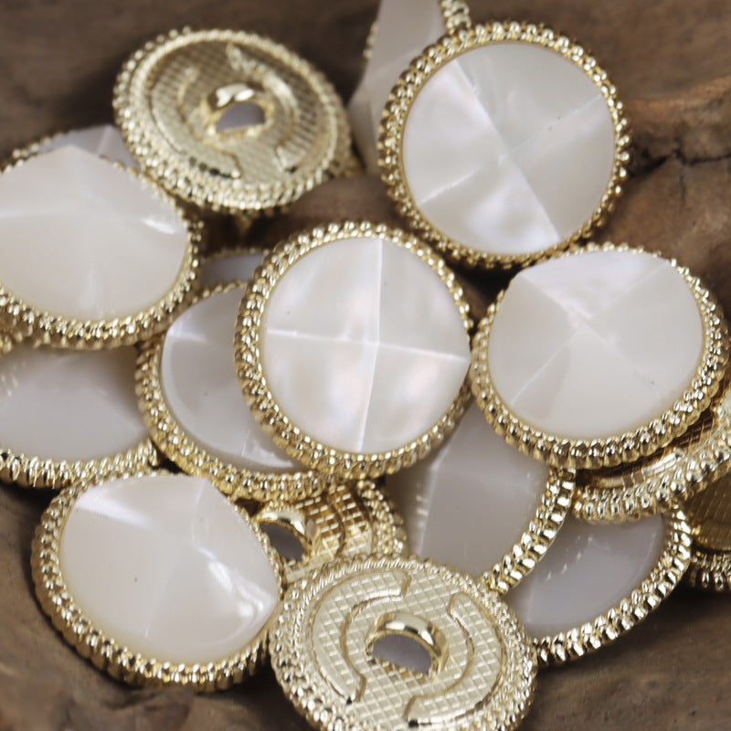 Buton cu bază metalică din aliaj de zinc auriu de 15mm cu perlă din rășină albă încrustată 10 bucăți
