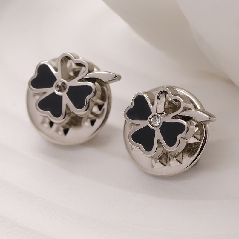 Broșă metalică cu floare cu patru foi aurie, argintie și neagră, set de 12 bucăți