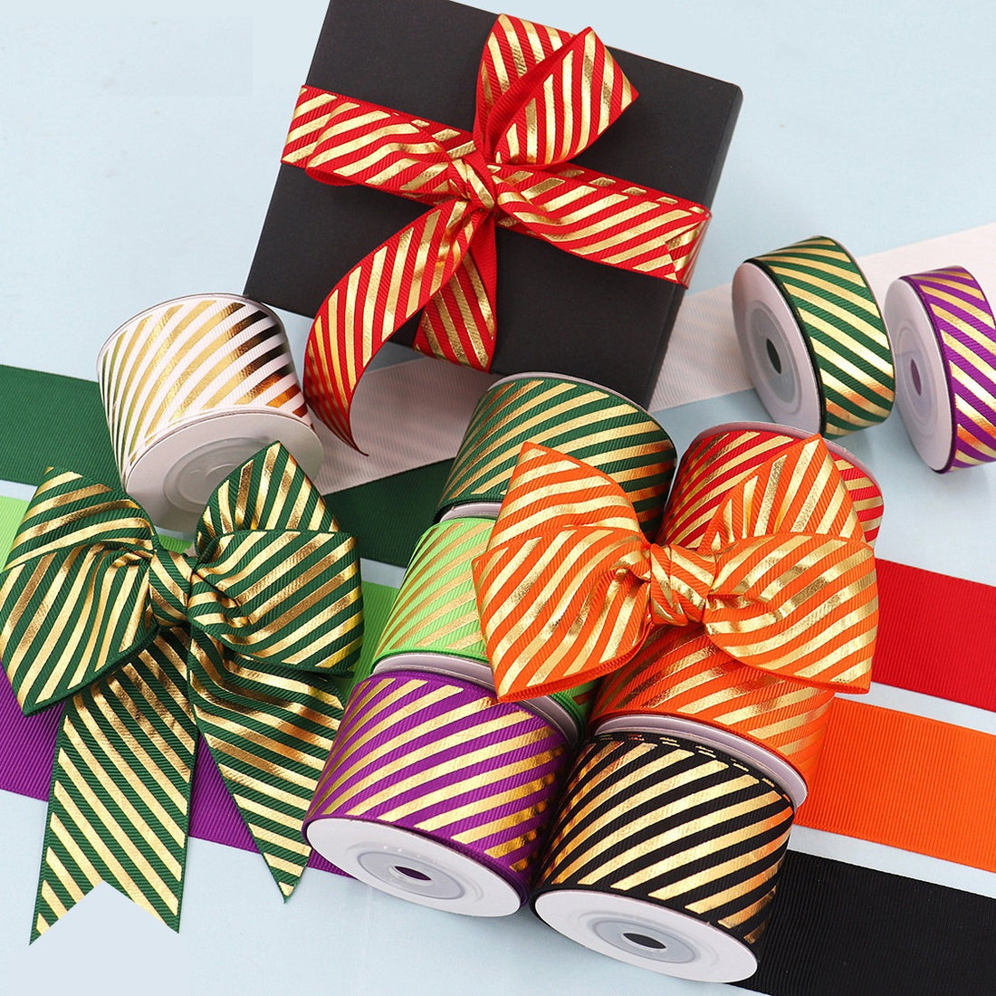 Panglică Grosgrain cu Dungi Diagonale Aurii 10/16/22/38mm, Set de 4 Bucăți