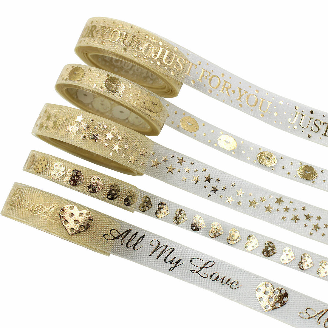 Panglică din tul cu folie aurie 9/16mm, model zăpadă, inimă și dragoste, set de 5, 50 de yarzi