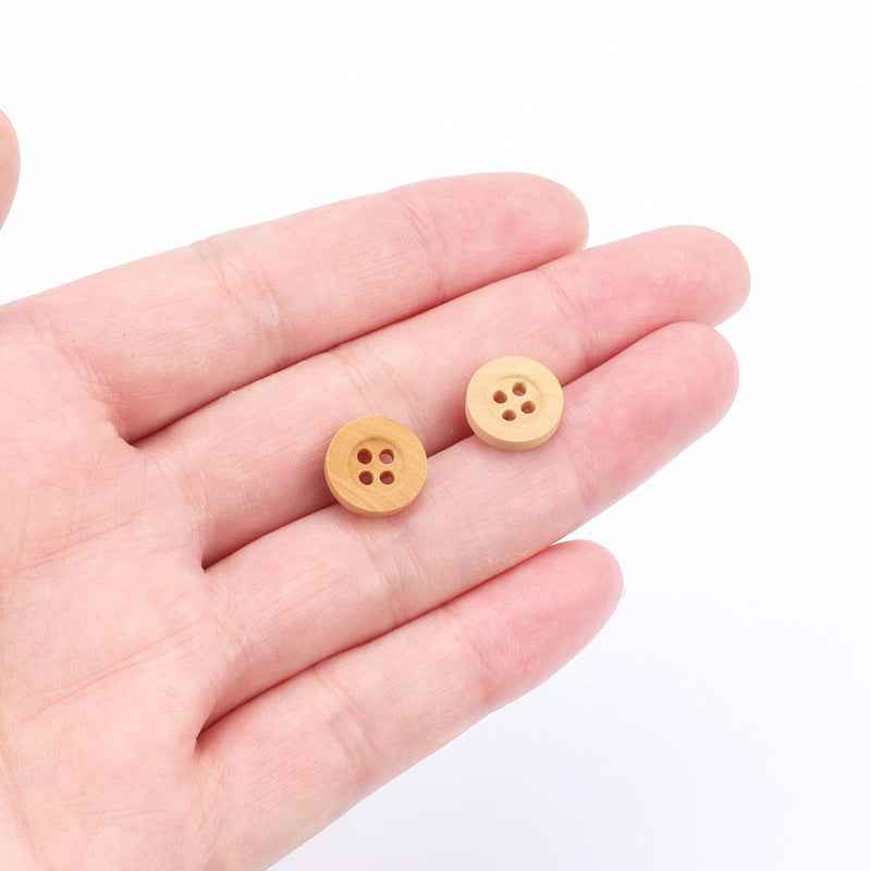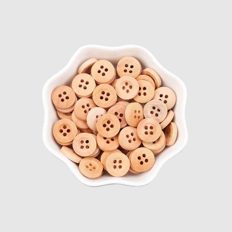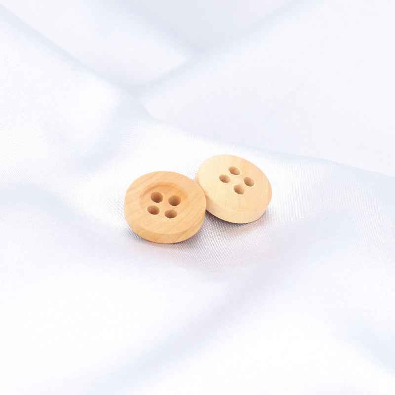 Acești nasturi rotunzi de 11,5 mm sunt realizați din lemn natural de plop, având patru găuri. Culoarea naturală a lemnului oferă un aspect simplu și pur, fiind deosebit de potrivită pentru obiectele realizate manual de copii.