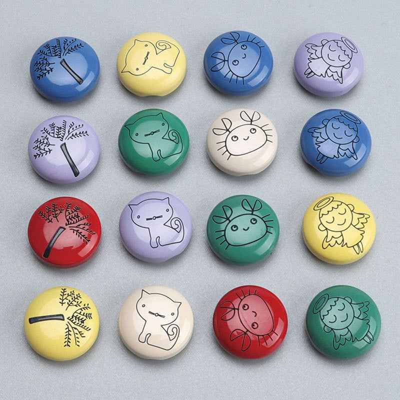 Acești nasturi din rășină de 11mm sunt o completare încântătoare pentru moda copiilor și proiectele DIY. Ei prezintă o varietate de modele viu colorate și fermecătoare de desene animate care atrag instantaneu privirea. Materialul din rășină este sigur, ușor și durabil, asigurând că pot rezista jocului activ al celor mici.