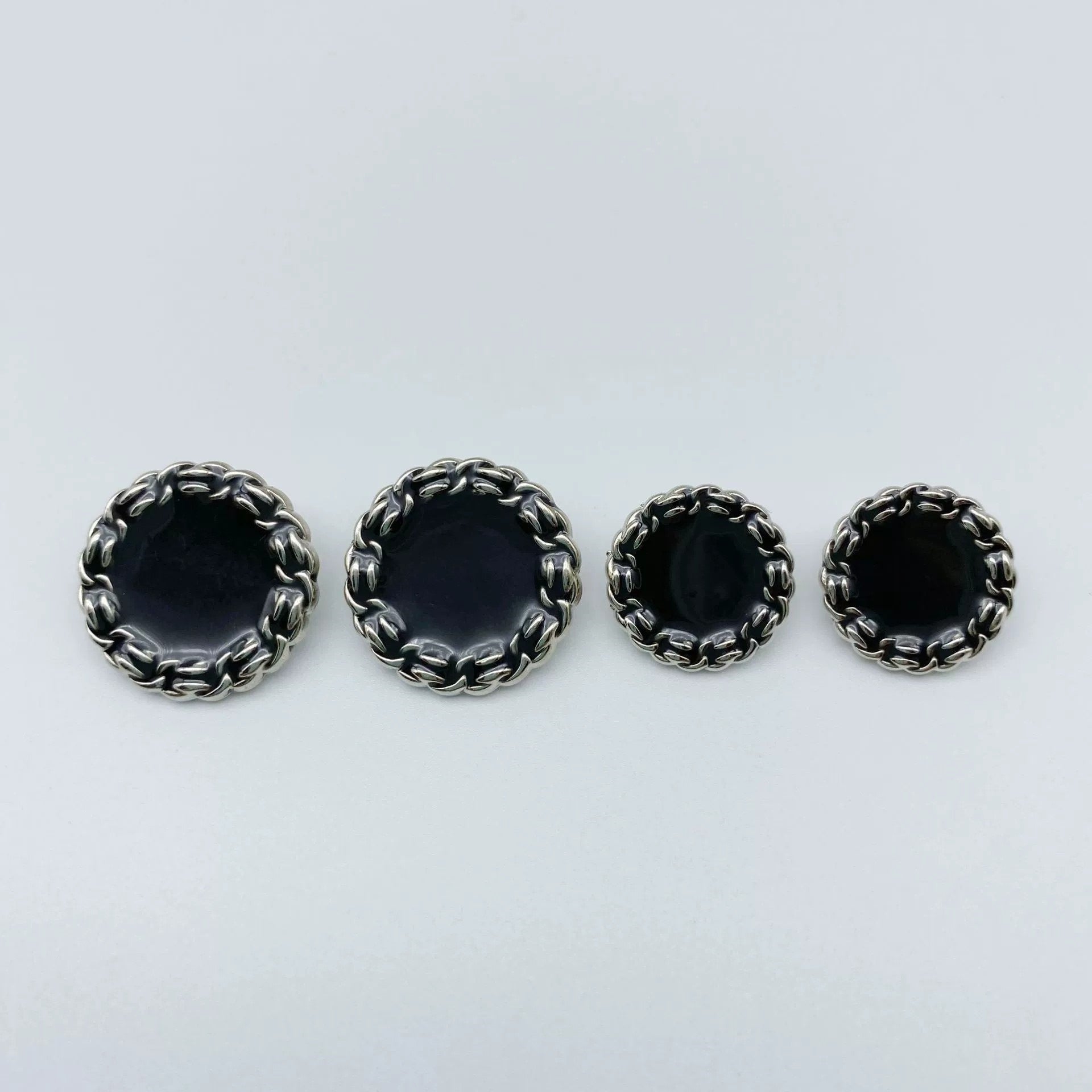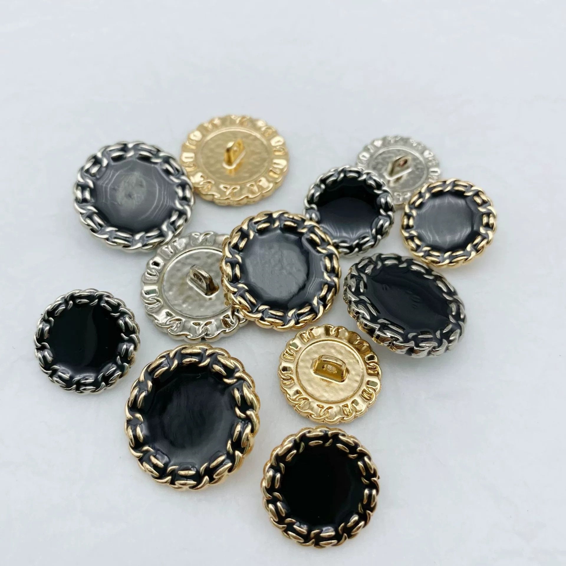 Îmbunătățește-ți pantalonii și proiectele DIY cu nasturii noștri negri din metal cu picior 18/23mm. Acești nasturi au un design clasic, realizați din metal de înaltă calitate cu un finisaj durabil. Designul cu picior asigură o atașare ușoară și sigură la hainele tale. Perfect pentru o varietate de aplicații, inclusiv îmbrăcăminte și accesorii, acești nasturi sunt o alegere ideală pentru cei care apreciază măiestria tradițională și accesoriile de modă unice.