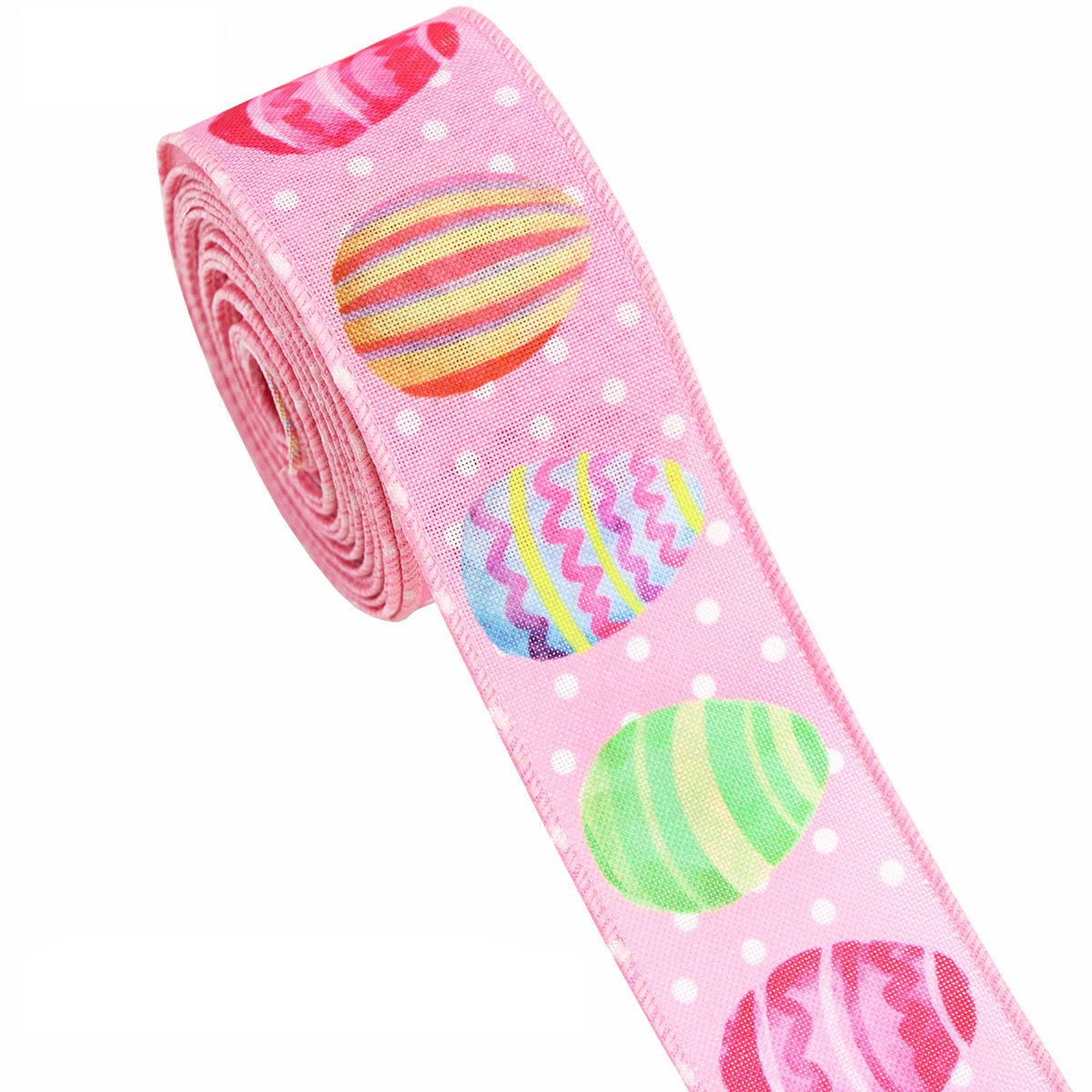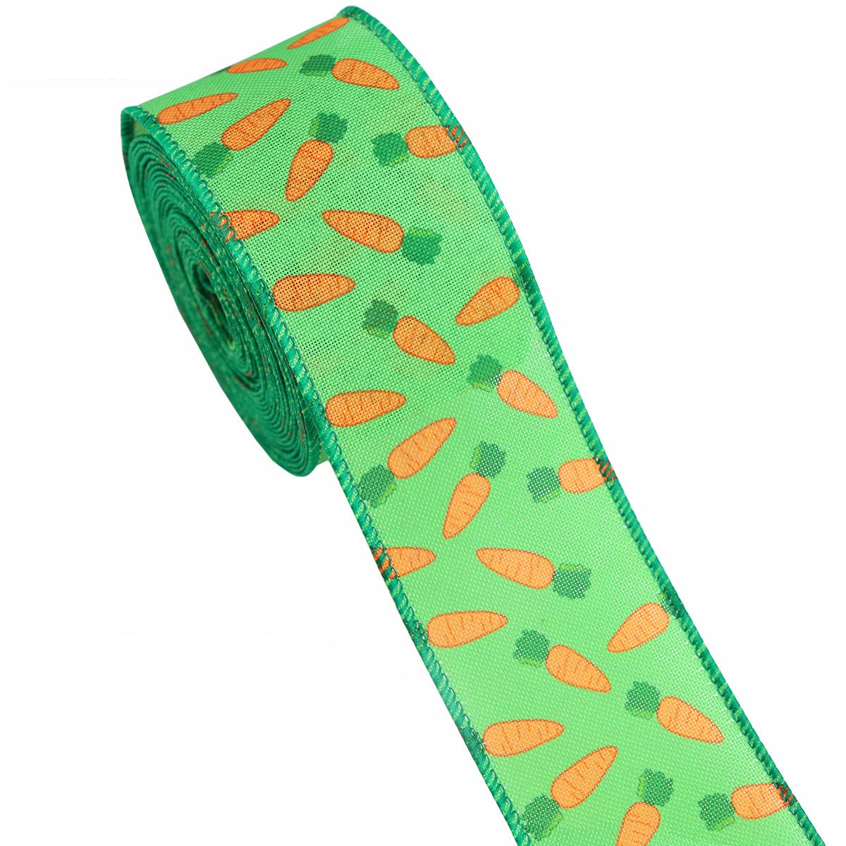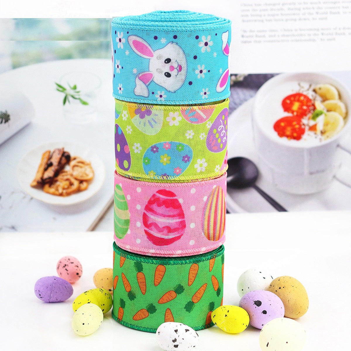 Bandă de tiv de Paște 2/2,5 inch cu margine de sârmă - Panglică Colorful Eggs, Bunnies, and Carrots, set de 4, 5 yarzi pe rolă
